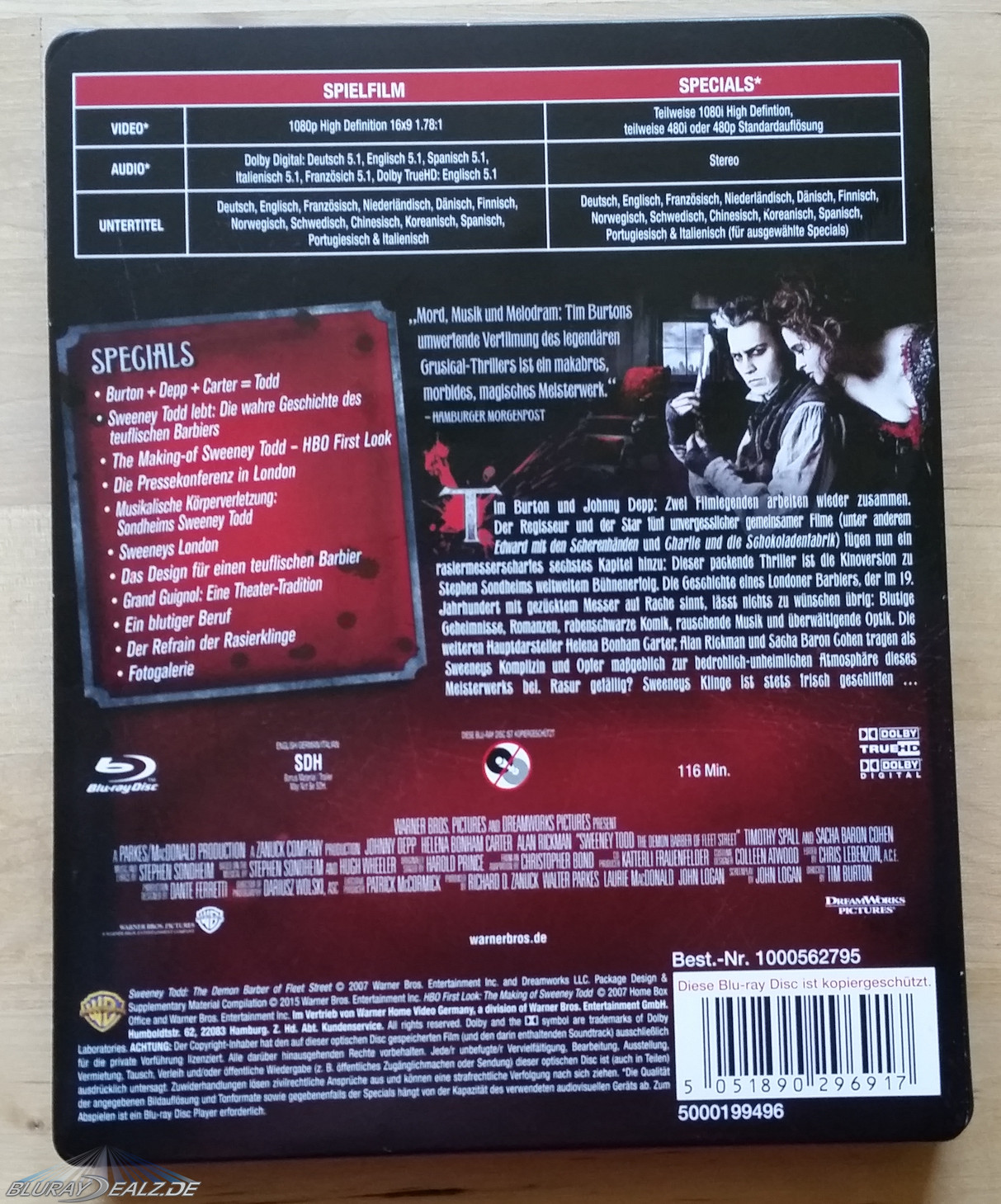 Natürlich handelt es sich bei dem Film um einen Sonderling, da es deutlich mehr gesungenen als gesprochenen Text gibt und das Düstere auch nicht jedermanns Sache ist. Wer aber Fan von Burton und/oder Depp ist und nichts gegen Musicals hat, macht mit dem Film sicher nichts falsch und mit dem Steelbook schon gar nicht. Bei einem entsprechend günstigen Drittanbieter-Angebot oder einer Neuauflage erteile ich hiermit eine klare Kaufempfehlung!