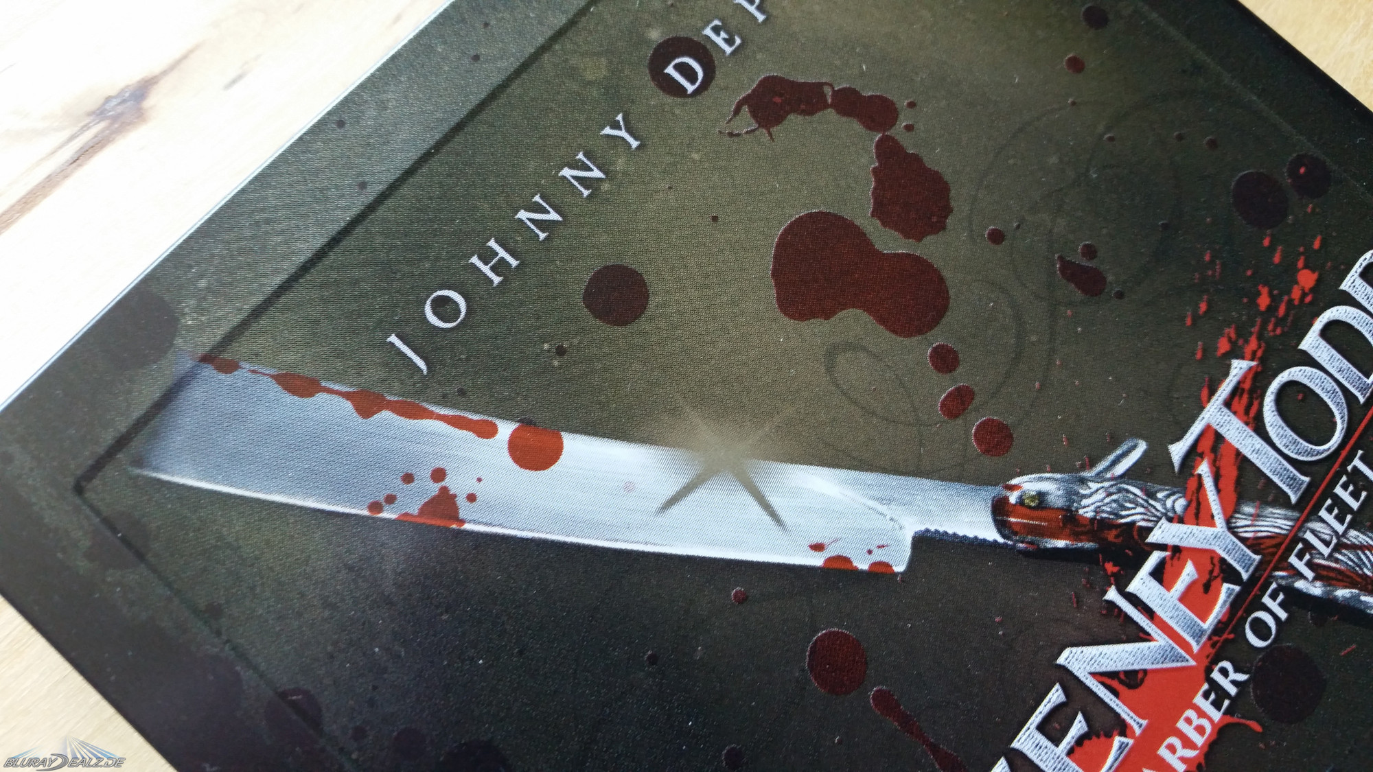Das Steelbook kommt – passend zum Film – äußerst düster daher. Der Rahmen ist, wie auch der Schriftzug „Sweeney Todd“, geprägt. Das Frontcover zeigt eines der Messer des teuflischen Barbiers und ist mit diversen Blutspritzern in unterschiedlich intensivem rot verziert. Vor allem beim Messer ist eine gewisse Liebe zum Detail festzustellen, da der Griff aufwändige Verzierungen erhalten hat und auf der Klinge eine kleine Lichtreflektion eingefangen wurde. Im Hintergrund sind noch einige silberne Verschnörkelungen zu erkennen. Die hellrote Linie unter dem Titel setzt sich über den Rand des Frontcovers hinaus bis zum Verschluss fort.