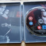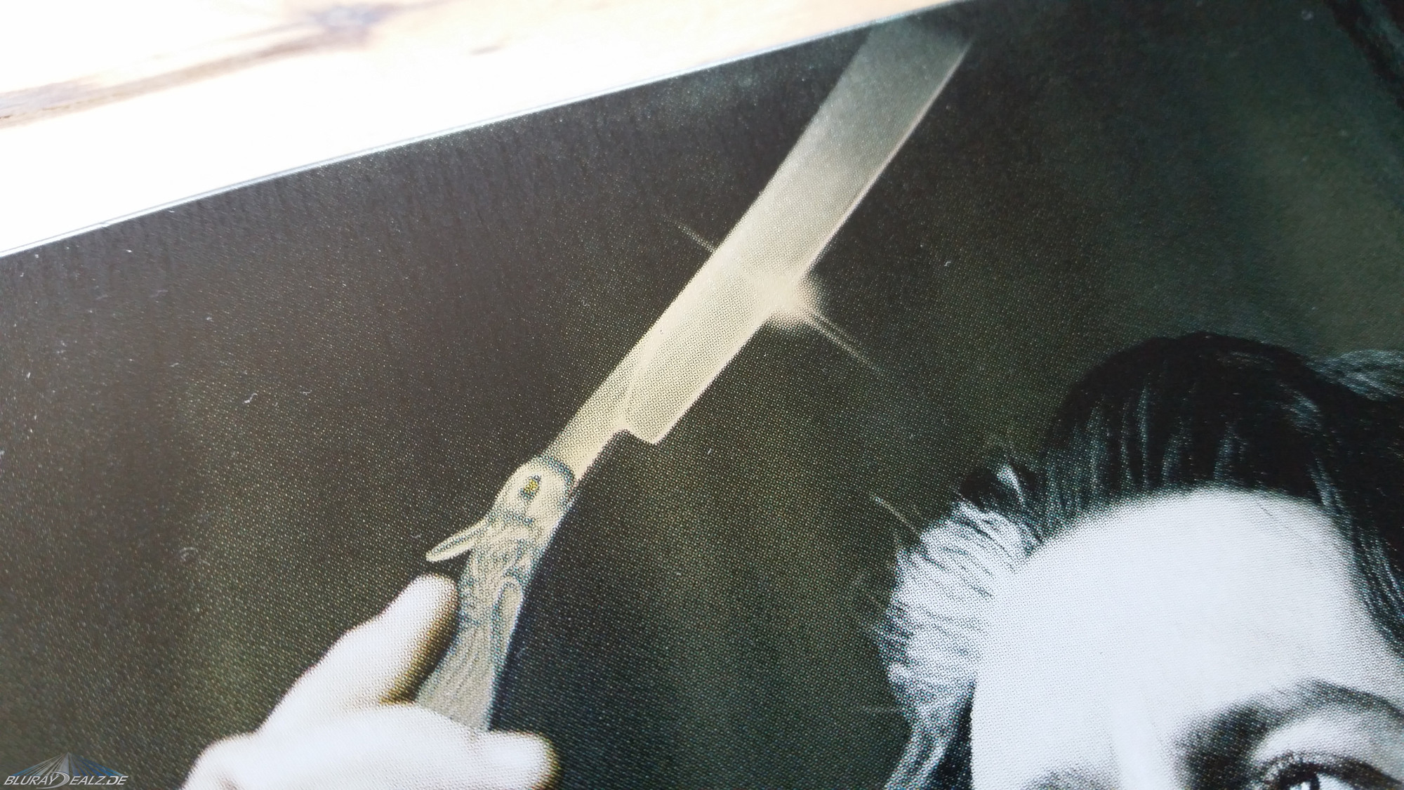 Zunächst hatte ich mir das Steelbook vorbestellt, weil es einen guten ersten Eindruck vermittelte und ich den Film unbedingt endlich mal sehen wollte. Beim Auspacken hat mich das Steel dann allerdings umgehauen: Es greift beinahe perfekt die abgrundtief düstere Stimmung des Films auf, arbeitet mit kleinen Highlights wie dem blitzenden Messer, der fortgesetzten Blutlinie oder der Schnörkel im Hintergrund und weist sogar noch Rahmen- und Titelprägung auf. Der Innendruck gefällt mir mit seinen dunkelroten Akzenten ebenfalls sehr gut, einzig an der Rückseite stören mich die Credits ein wenig. Mit einem insgesamt so gelungenen Stück hatte ich nicht gerechnet, schon gar nicht bei 14,99€ Startpreis – da sehen andere Steelbooks für mehr Geld nicht annähernd so gut aus.