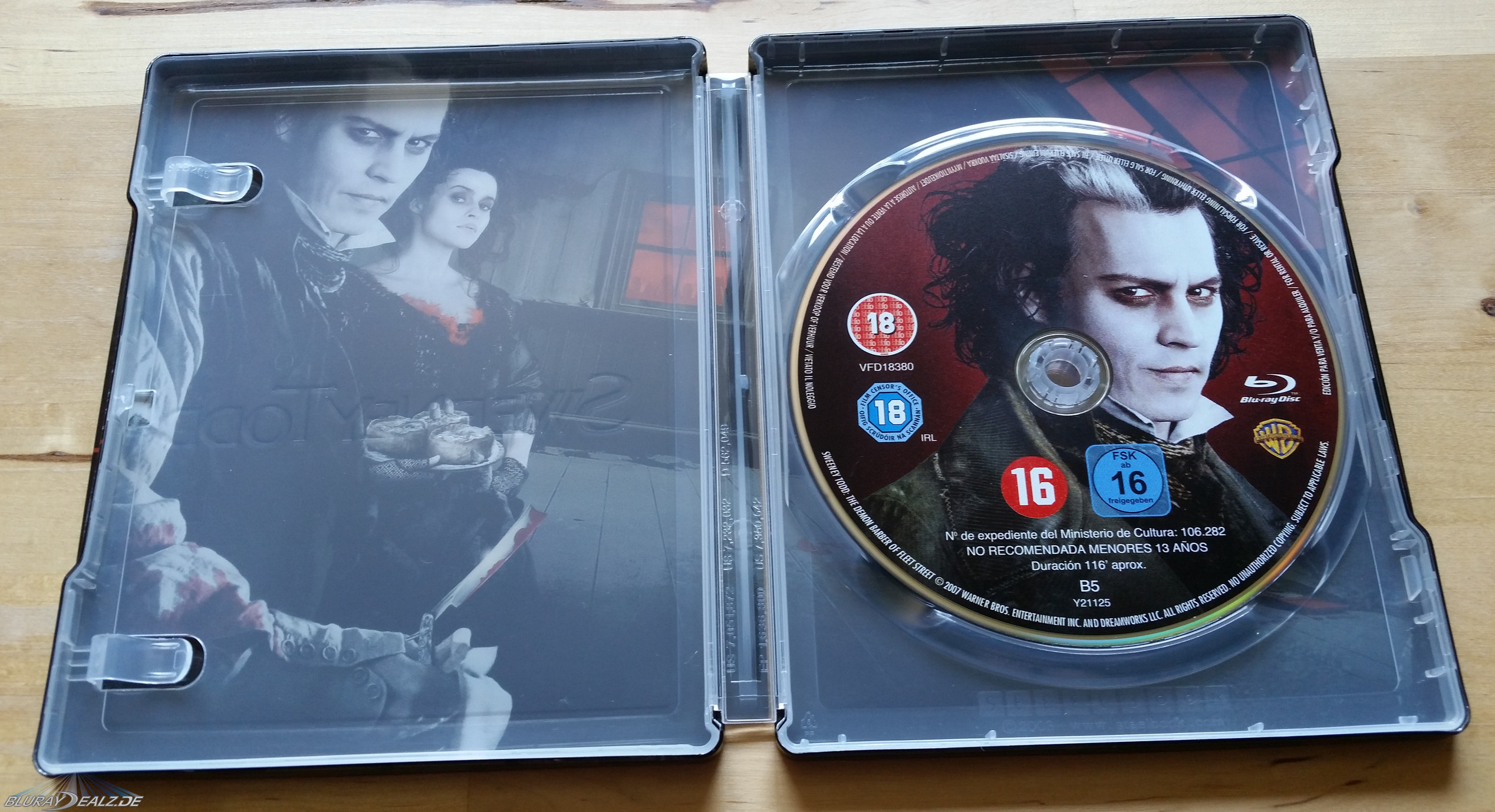 Im Inneren des Steelbooks ist im Hintergrund der Salon des Barbiers abgebildet. Während Boden und Decke eintönig düster gehalten sind, setzen Seiten- und Dachfenster, sowie der Stuhl blutrote Akzente. Links im Vordergrund sind Sweeney Todd und seine Komplizin Mrs. Lovett zu sehen. Bei beiden ist der Kontrast zwischen hellen und dunklen Abschnitten äußerst stark und auch hier finden sich kleinere rote Akzente auf dem Messer, sowie an der Kleidung.