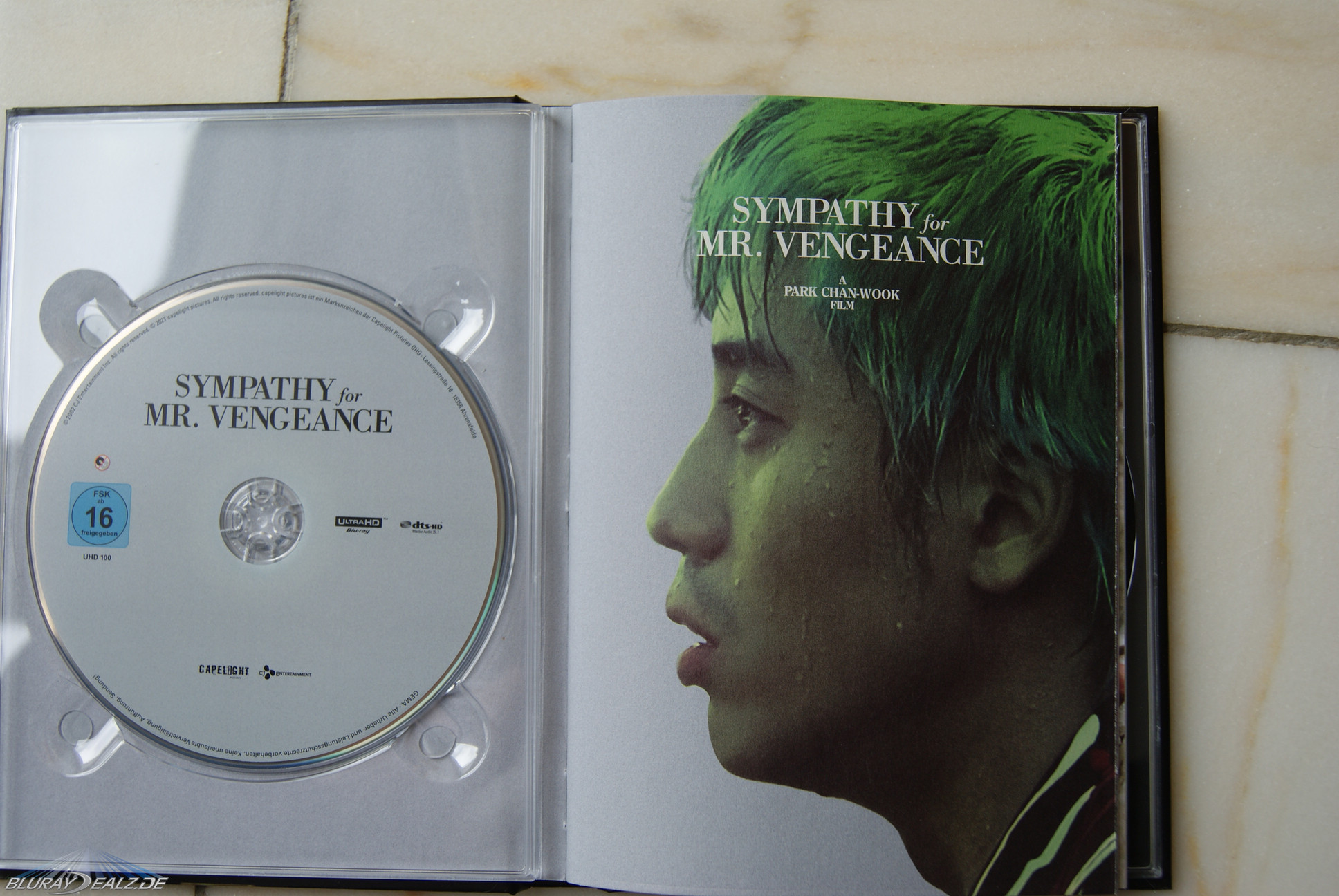 Das Mediabook trägt wie gewohnt bei 4k-Mediabooks aus dem Hause Capelight alle Angaben zum Film (Inhalt, Extras, Specs) sowie den FSK-Flatschen auf der lose umgelegten C-Card. Das Mediabook selbst ist matt gehalten und zeigt die Hauptcharaktere auf der Front (inkl. Titel und dem Beisatz „A Park Chan-Wook Film“), ein bekanntes Motiv des Films. Die Rückseite zeigt wiederum ein Szenenbild im kompletten Großformate – das war mal wieder an der Zeit bei Capelight. Schnörkellos steht der Titel des Films zudem auf dem Spine.