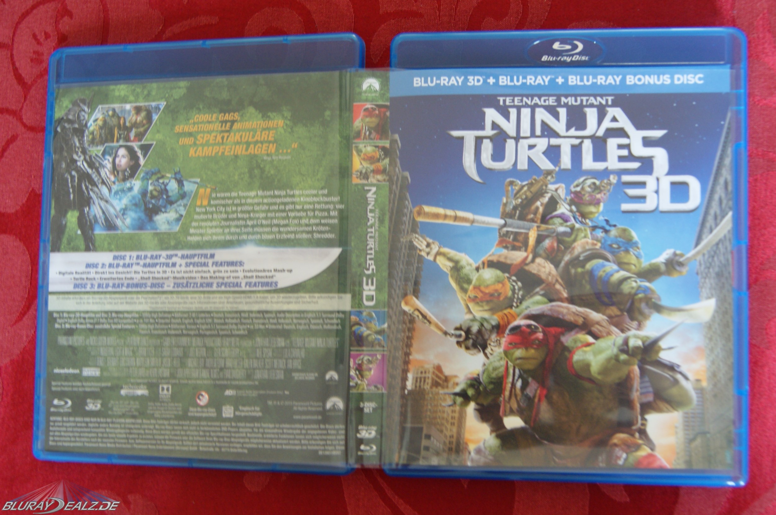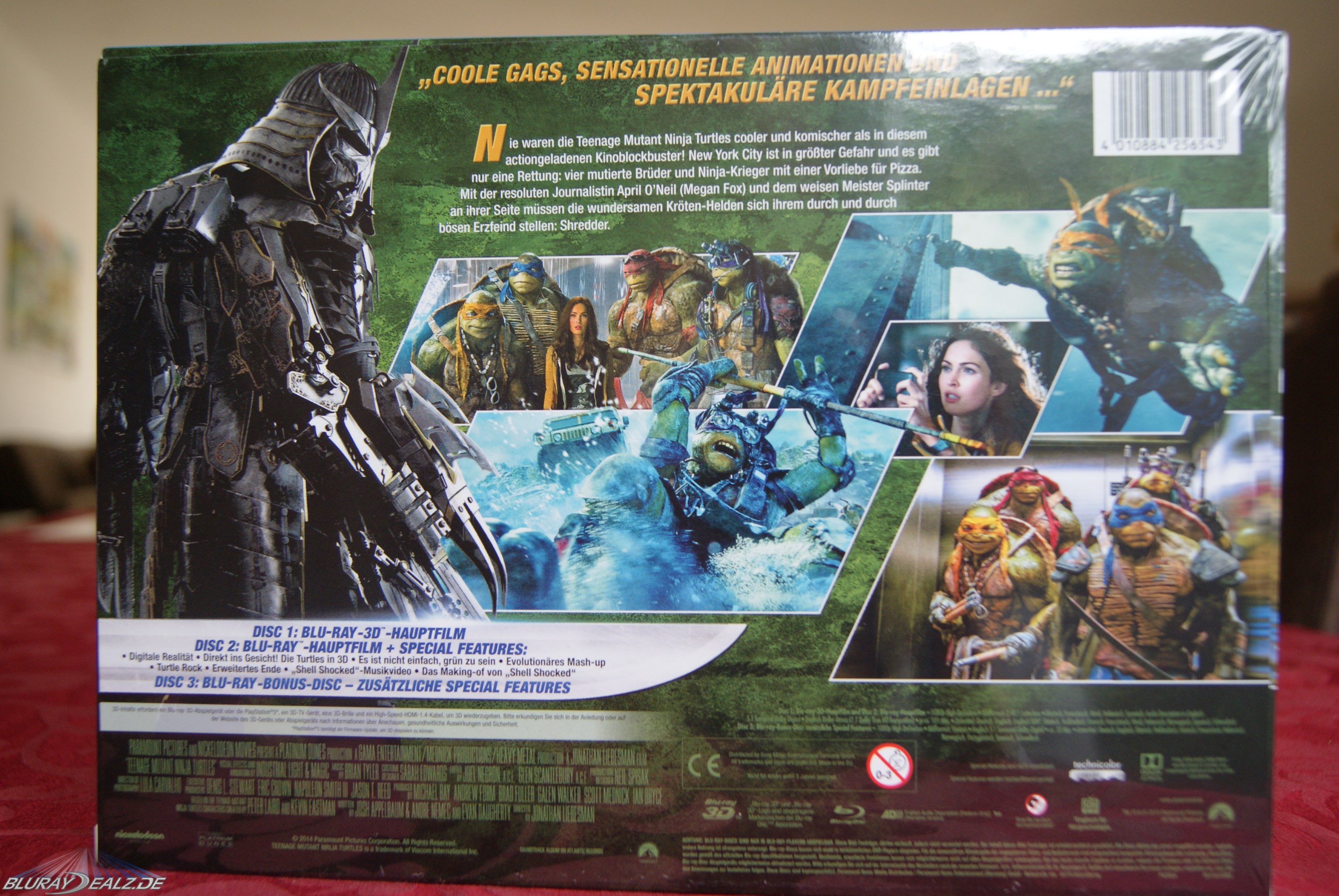 Die von Paramount am 5. März 2015 veröffentlichte Special Edition bietet neben der 3 Discs umfassenden 3D-Version des Films (natürlich auch in 2D enthalten) auch vier 6 bis 7 cm große Figuren der Turtles und eine recht ansprechende Verpackung.