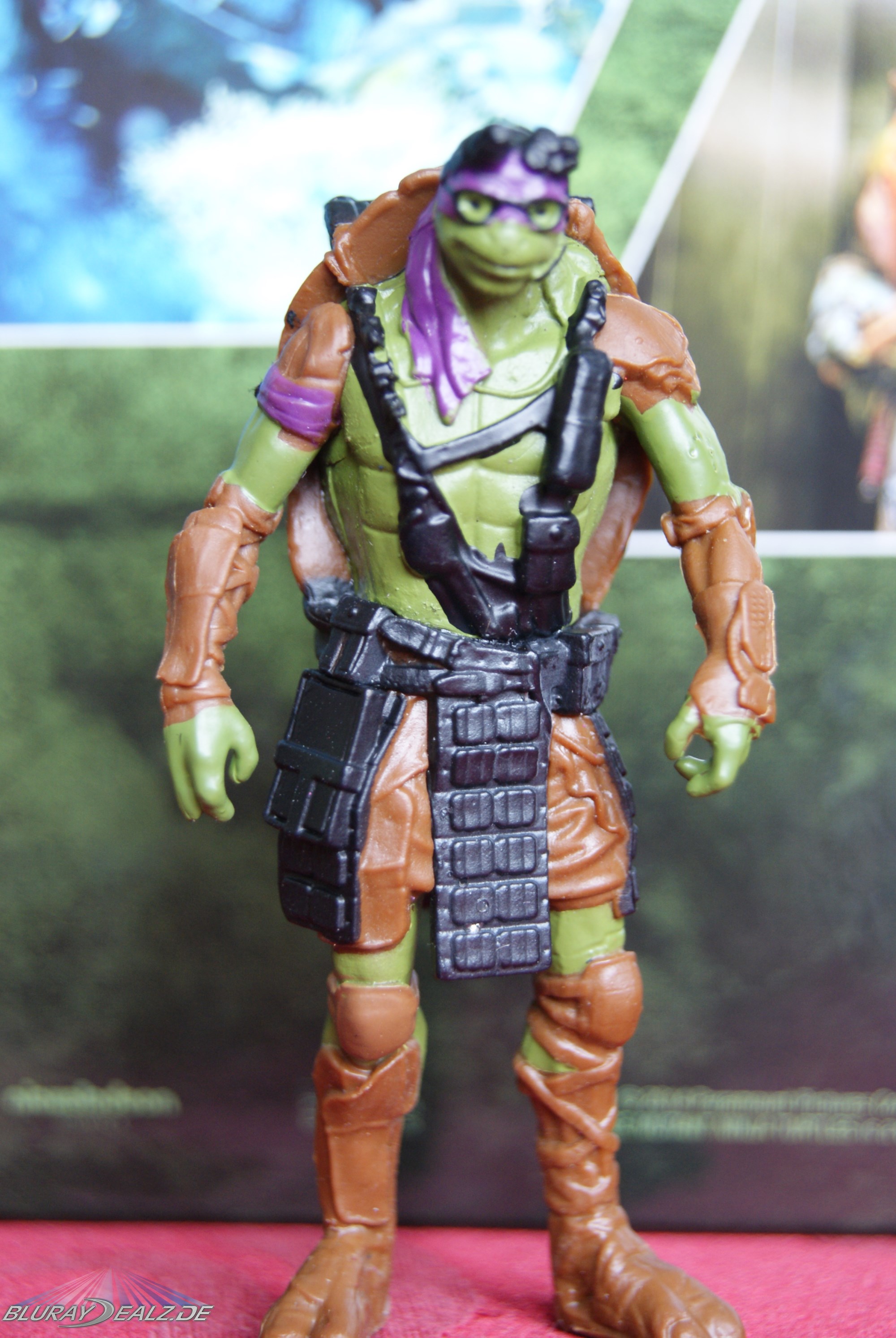 Das gibt die Figuren aus dem Film eigentlich im Vergleich auch recht gut wieder. Die Sammelfiguren sind für die Größe auch recht detailliert (technische Ausrüstung bei Donatello, getapter Rückenpanzer bei Raphael, helleres Grün bei Michelangelo u.v.m.) und ganz gut bemalt (auch wenn ich hier schon gegenteiliges gelesen hatte, vielleicht gibt’s da Unterschiede – zumindest in der Bemalung). Ein bisschen langweilig ist lediglich die sehr ähnliche Haltung der vier Brüder (abgesehen von Donatello vielleicht).