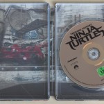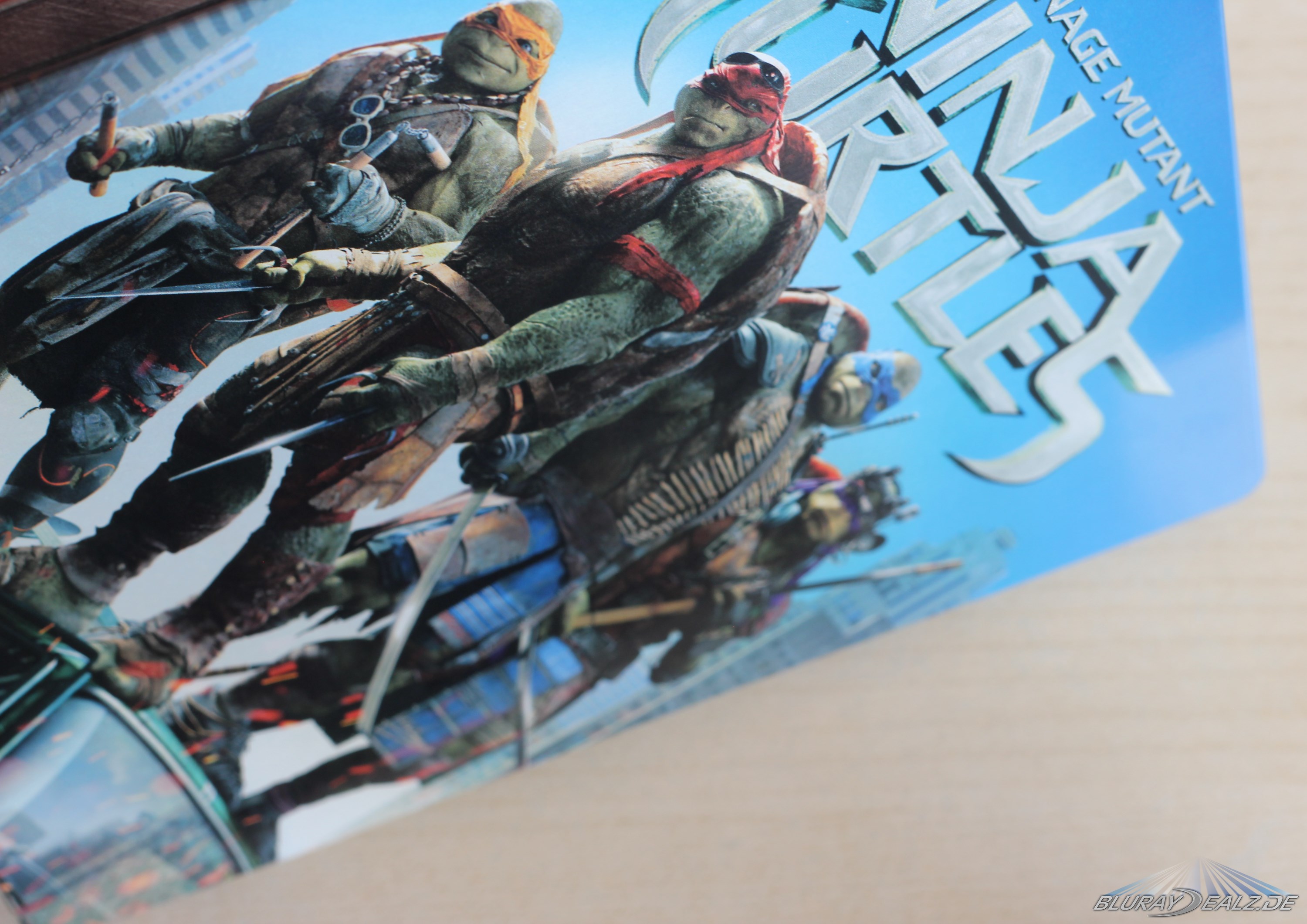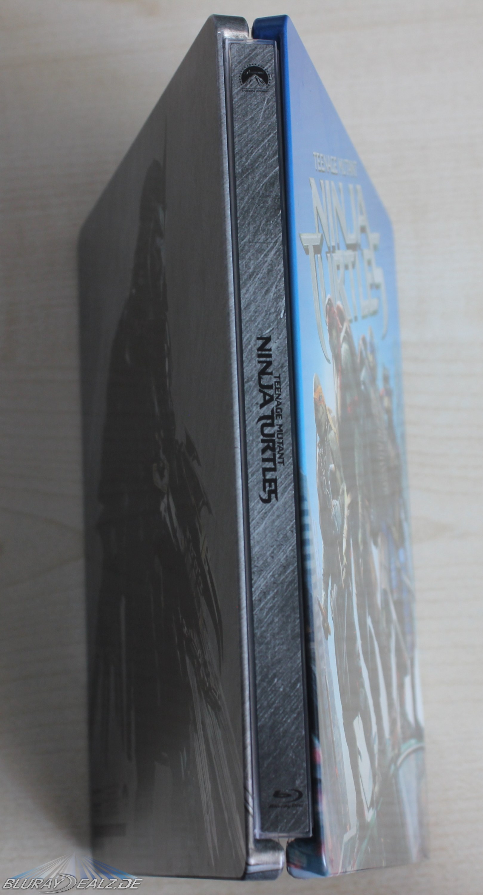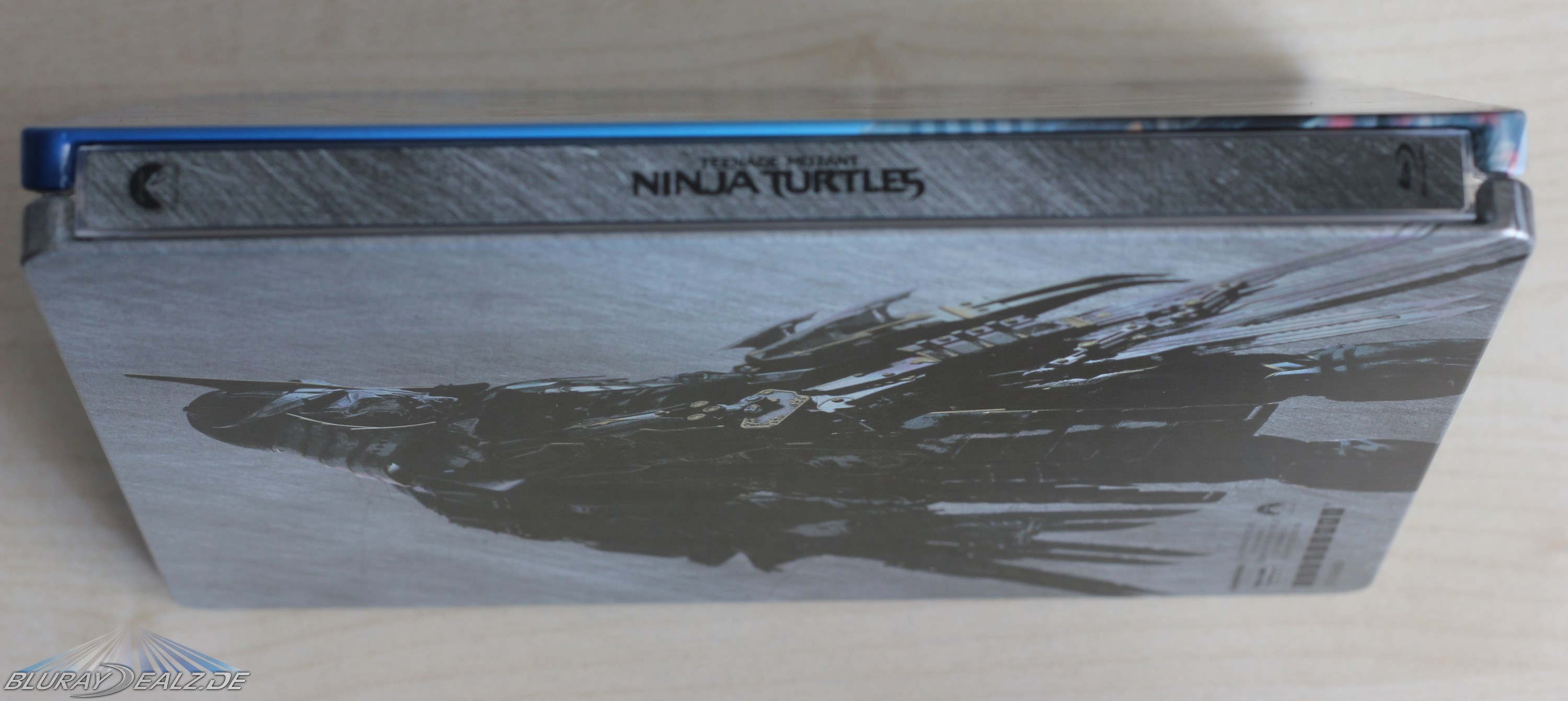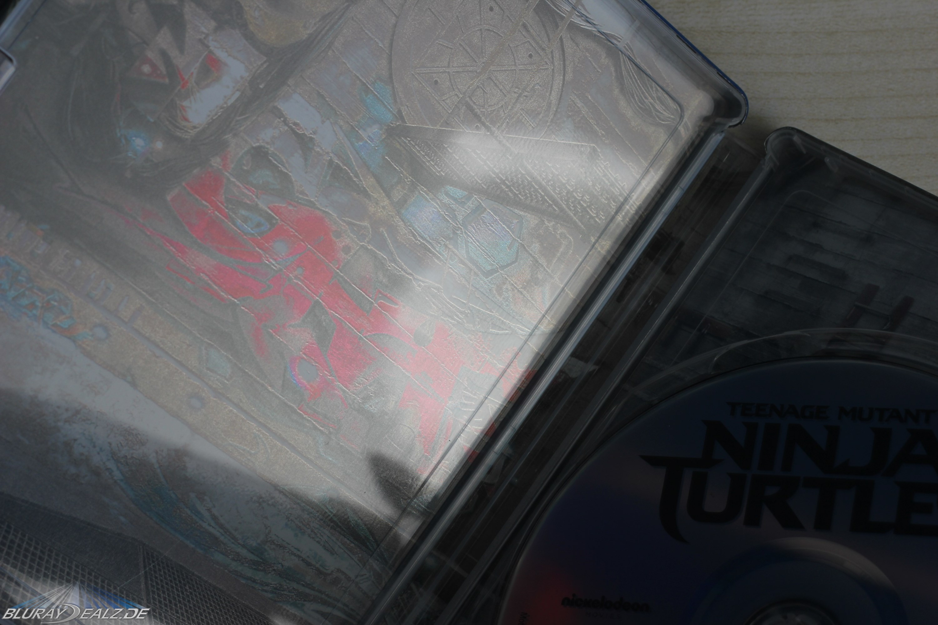 Nachdem Müller in letzter Zeit vor allem Steelbooks mit einem relativ blassen Druck verlegt hat (Brick Mansions, Predestination), die design-technisch eher schwach waren, beginnt TMNT erneut an alte Stärke zu erinnern. Die Farben sind kräftig, der Druck ist detailliert und die Frontseite ist in einer schicken Hochglanz-Optik gehalten. Der Titel ist leider nicht geprägt, was besonders schade ist, da bisherige Paramount-Steels, die exklusiv bei Müller erschienen sind, durchgehend über eine Prägung verfügt haben. Ein wenig als Entschädigung mag dafür gelten, dass es bei Neigung des Steelbooks zu einem netten Glanzeffekt des gesamten Titels kommt.