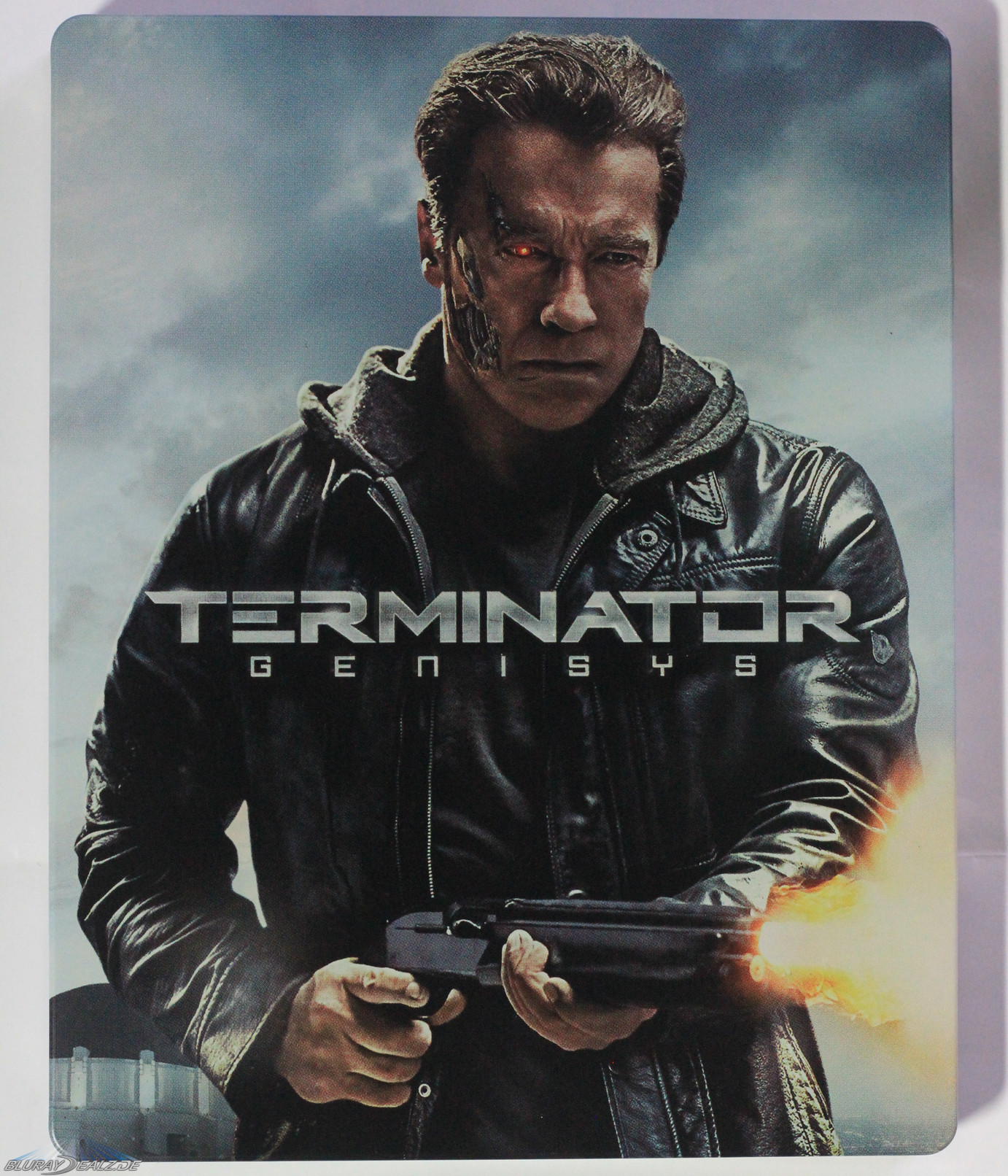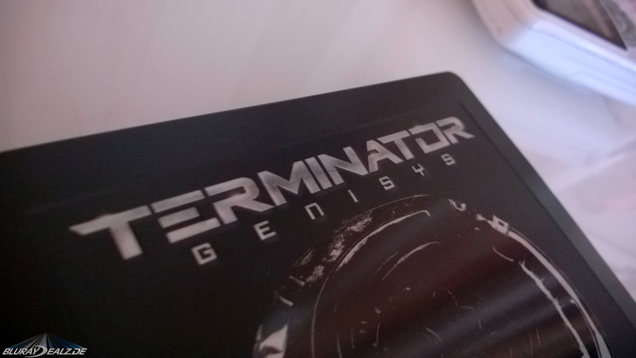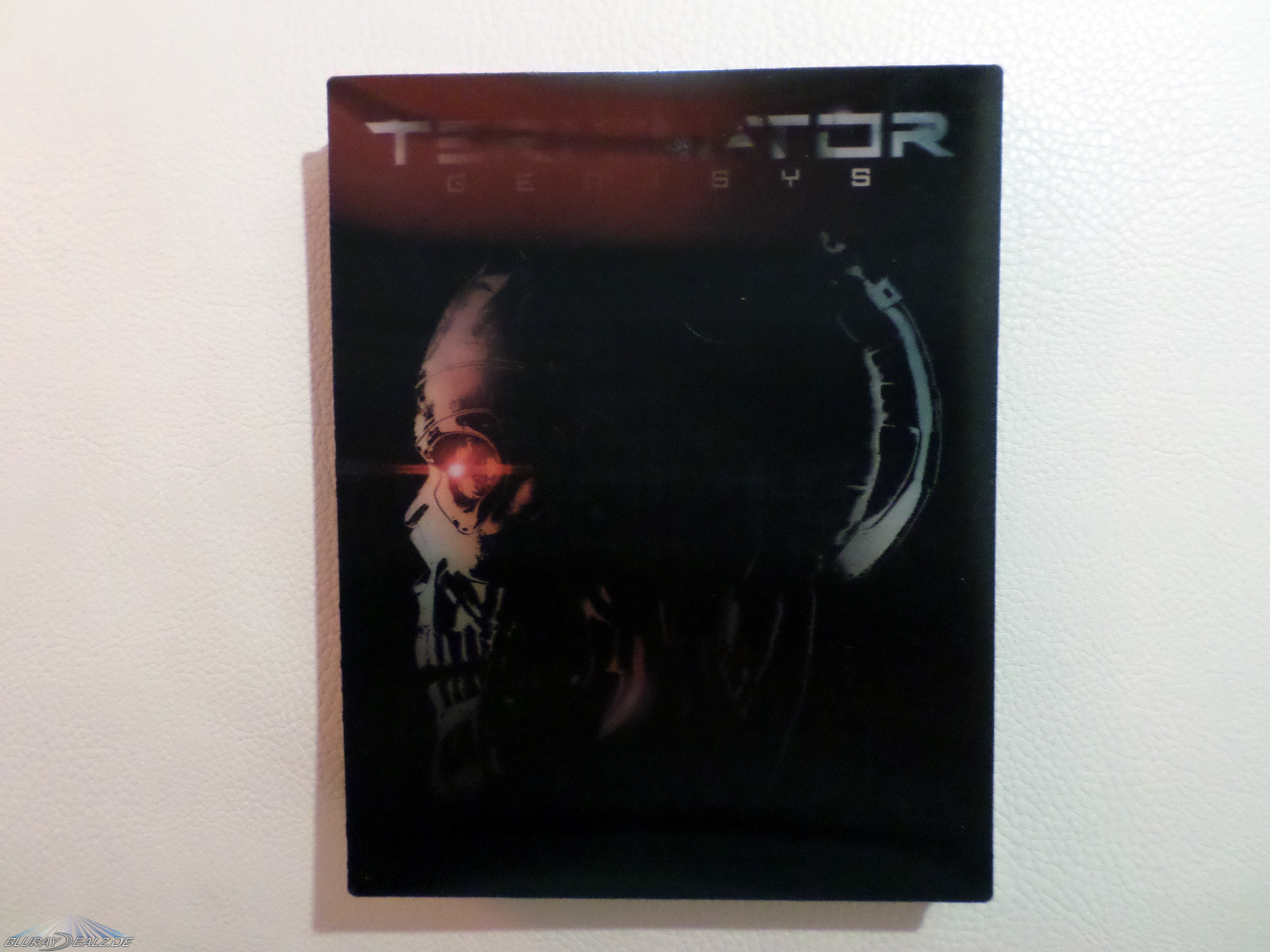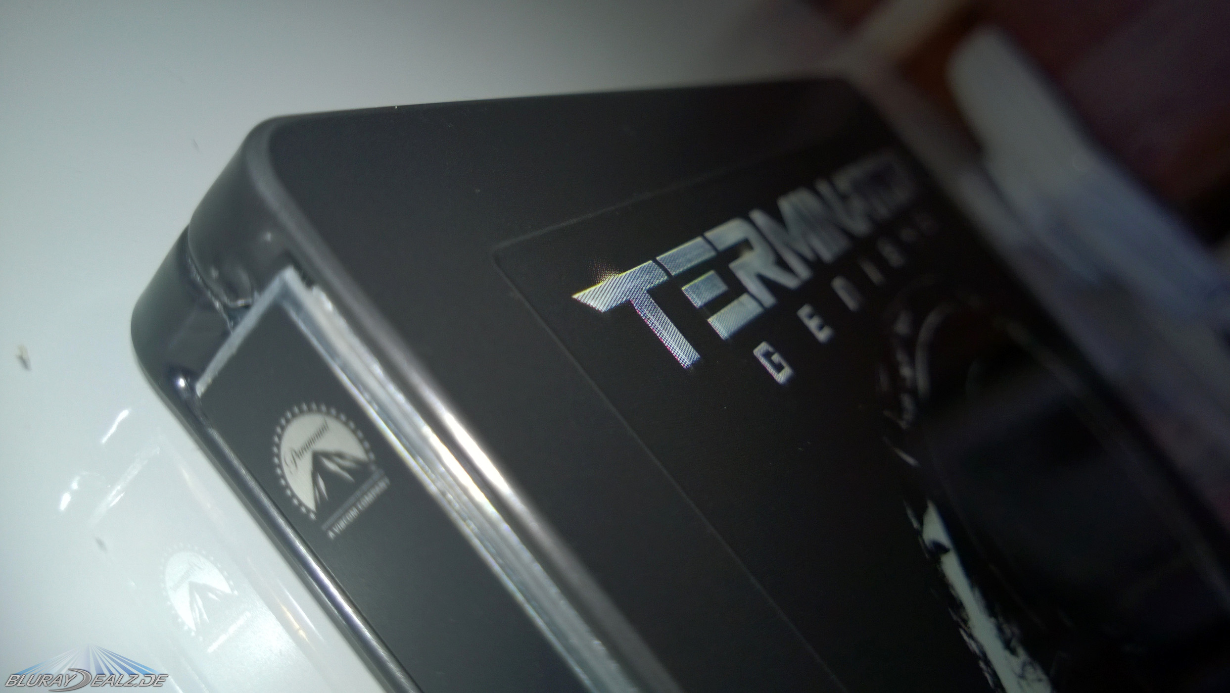 Die Vorderseite zeigt Arnie als T-800 in Frontalansicht. Dabei ist Arnie leicht glänzend (Spot Gloss mit Schimmereffekt), während der restliche Hintergrund matt gehalten ist. Zudem liegt eine Rahmenprägung vor und der Titel ist geprägt. Dabei fällt auf, dass „Genisys“ wohl bereits zu fein für den Prägeprozess war, weshalb dieser Teil des Titels in kleinen Quadraten geprägt worden ist. Die Prägung sieht insgesamt äußerst edel aus.
