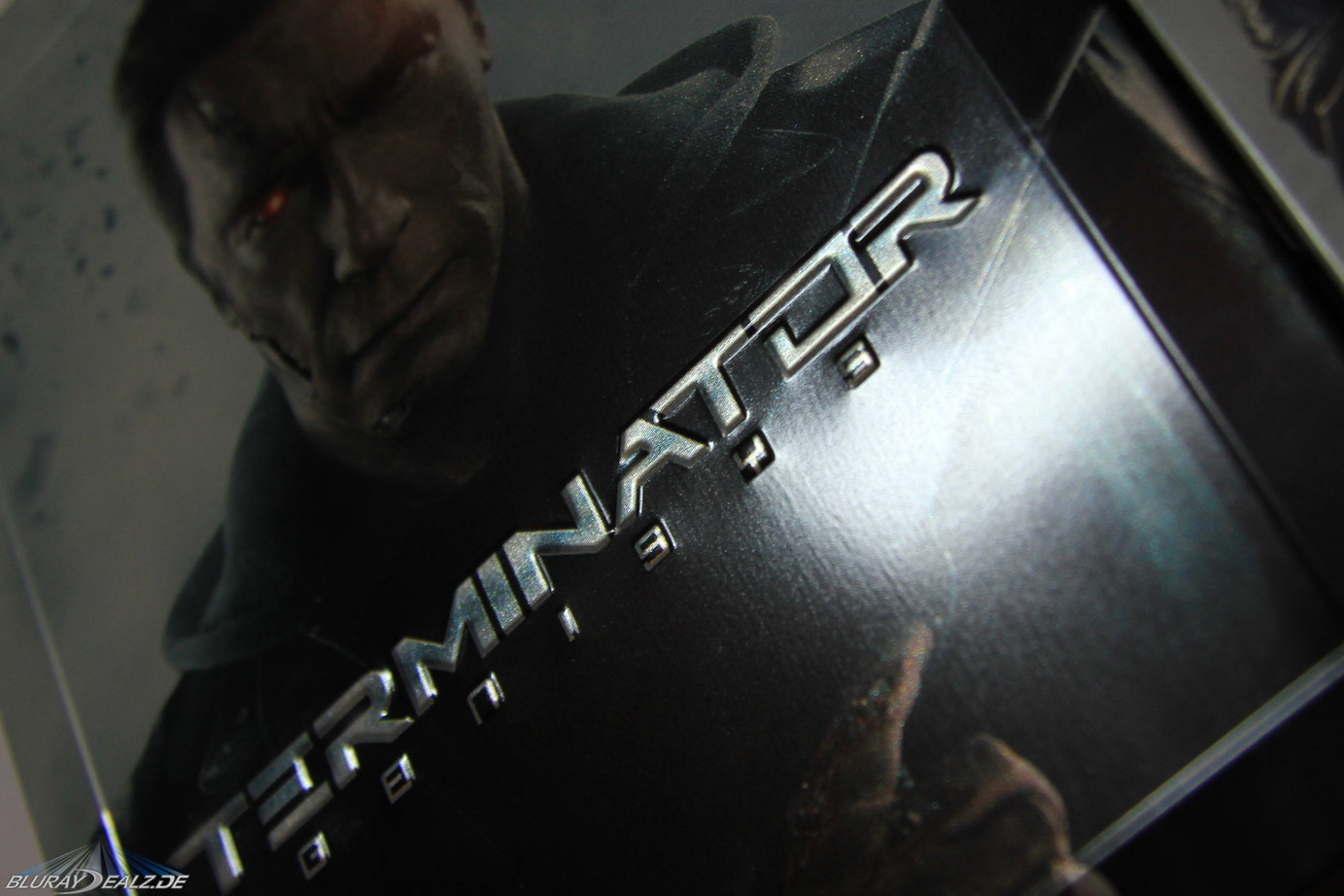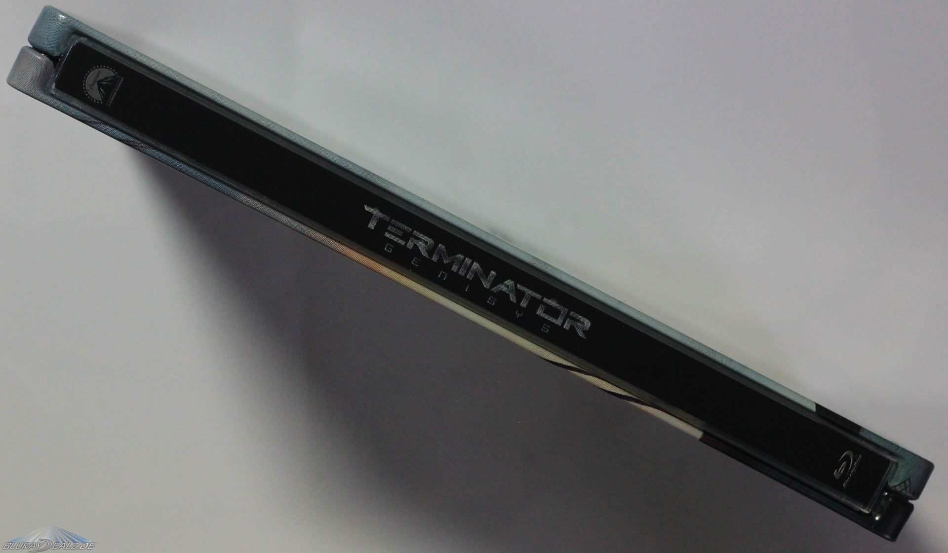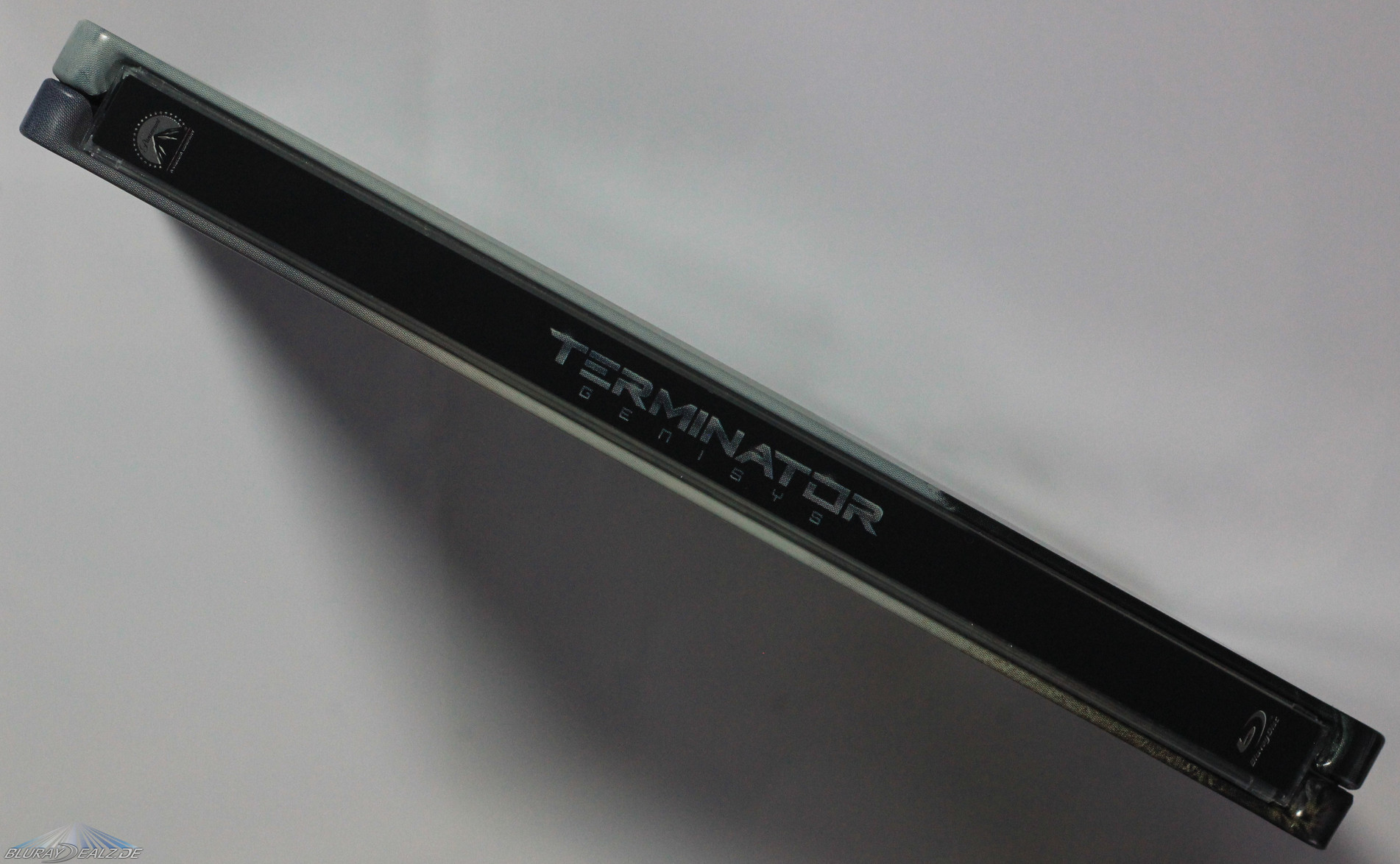 Die Vorderseite zeigt Arnie als T-800 in Frontalansicht. Dabei ist Arnie leicht glänzend (Spot Gloss mit Schimmereffekt), während der restliche Hintergrund matt gehalten ist. Zudem liegt eine Rahmenprägung vor und der Titel ist geprägt. Dabei fällt auf, dass „Genisys“ wohl bereits zu fein für den Prägeprozess war, weshalb dieser Teil des Titels in kleinen Quadraten geprägt worden ist. Die Prägung sieht insgesamt äußerst edel aus.