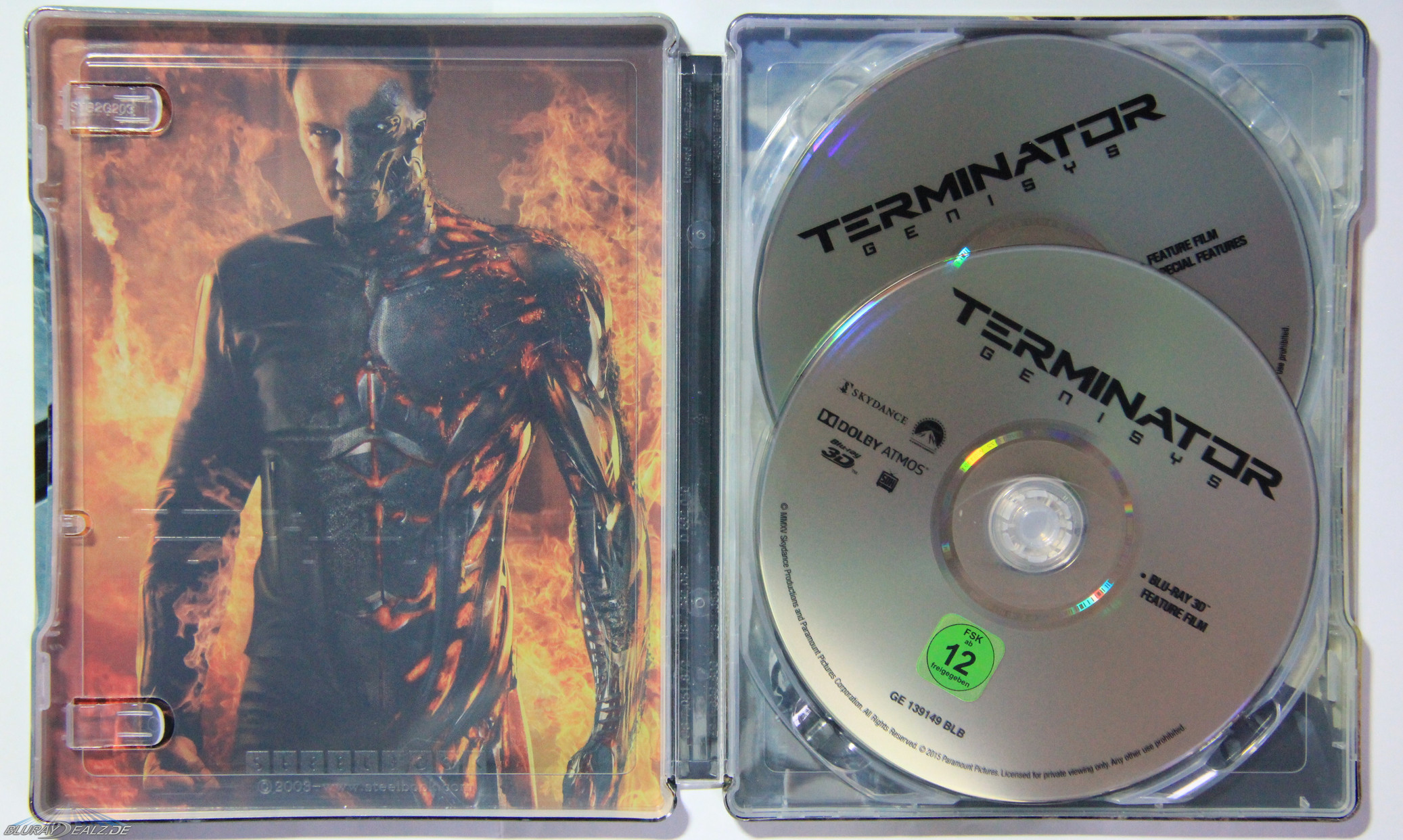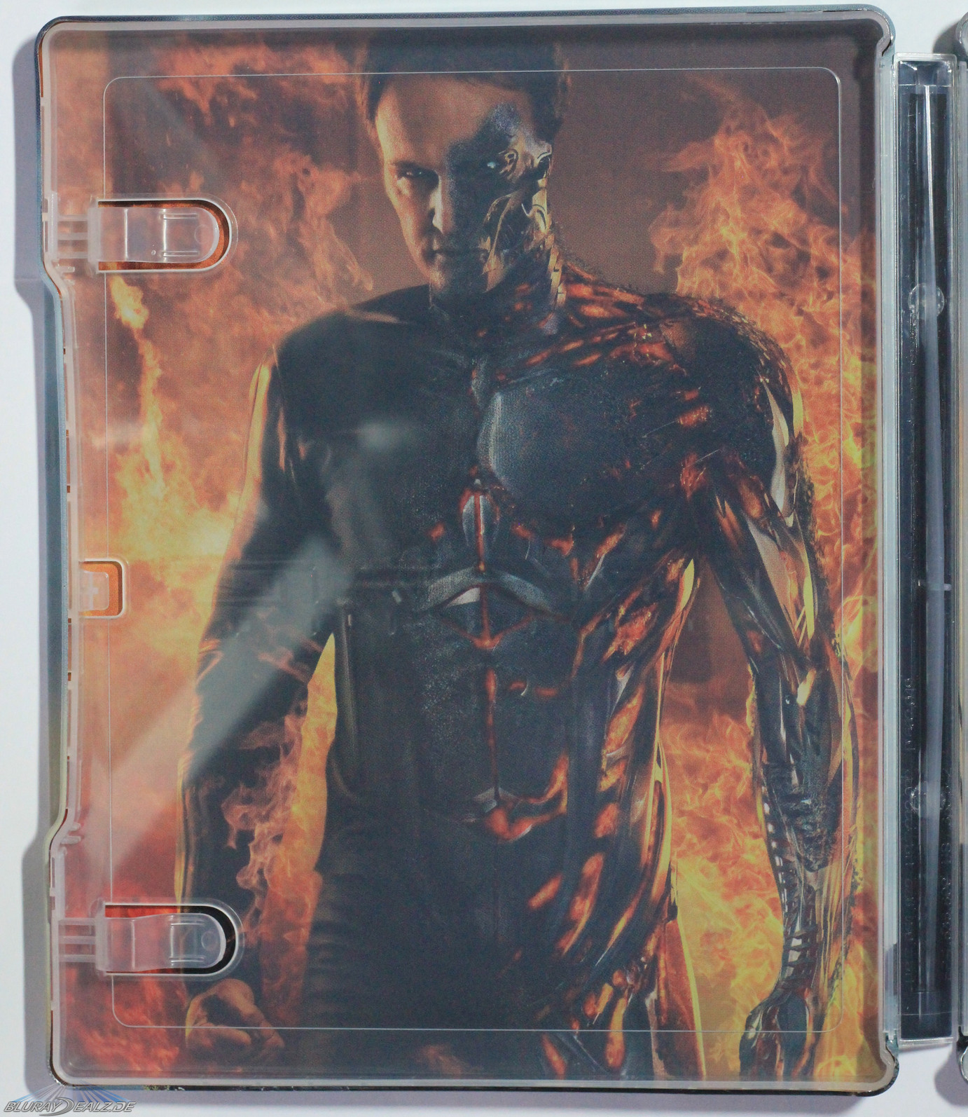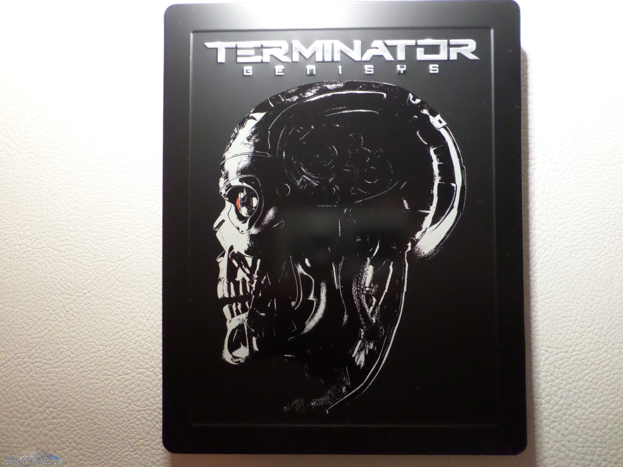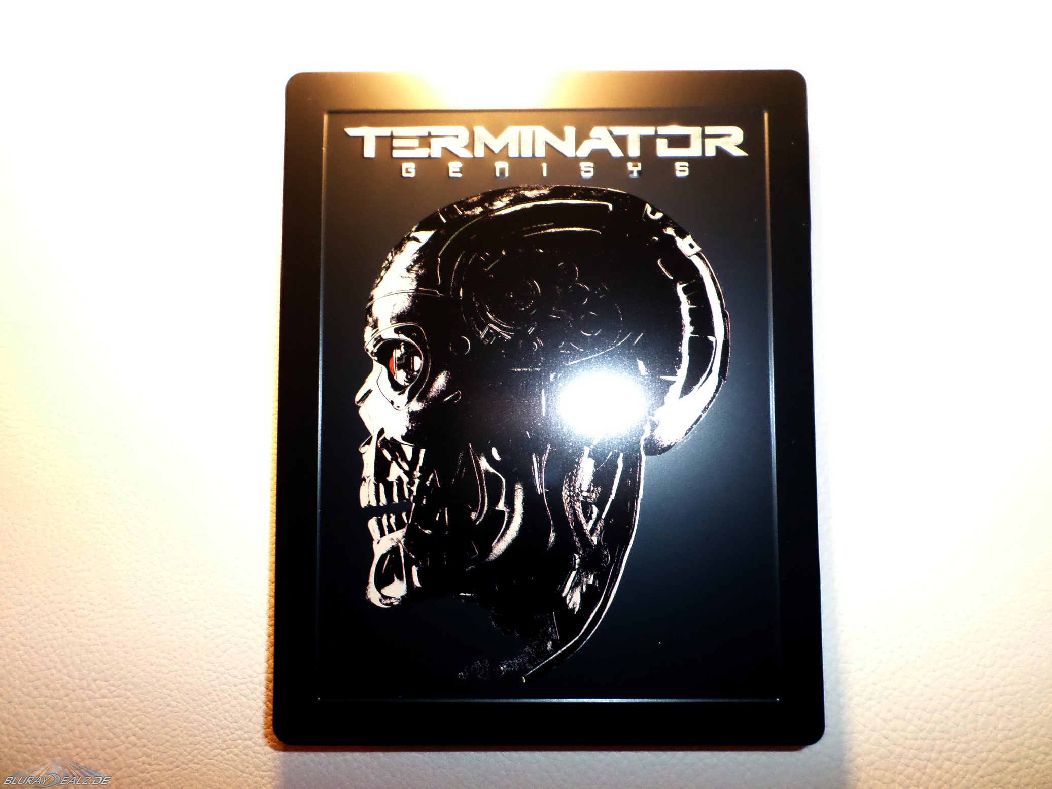Die Vorderseite zeigt Arnie als T-800 in Frontalansicht. Dabei ist Arnie leicht glänzend (Spot Gloss mit Schimmereffekt), während der restliche Hintergrund matt gehalten ist. Zudem liegt eine Rahmenprägung vor und der Titel ist geprägt. Dabei fällt auf, dass „Genisys“ wohl bereits zu fein für den Prägeprozess war, weshalb dieser Teil des Titels in kleinen Quadraten geprägt worden ist. Die Prägung sieht insgesamt äußerst edel aus.