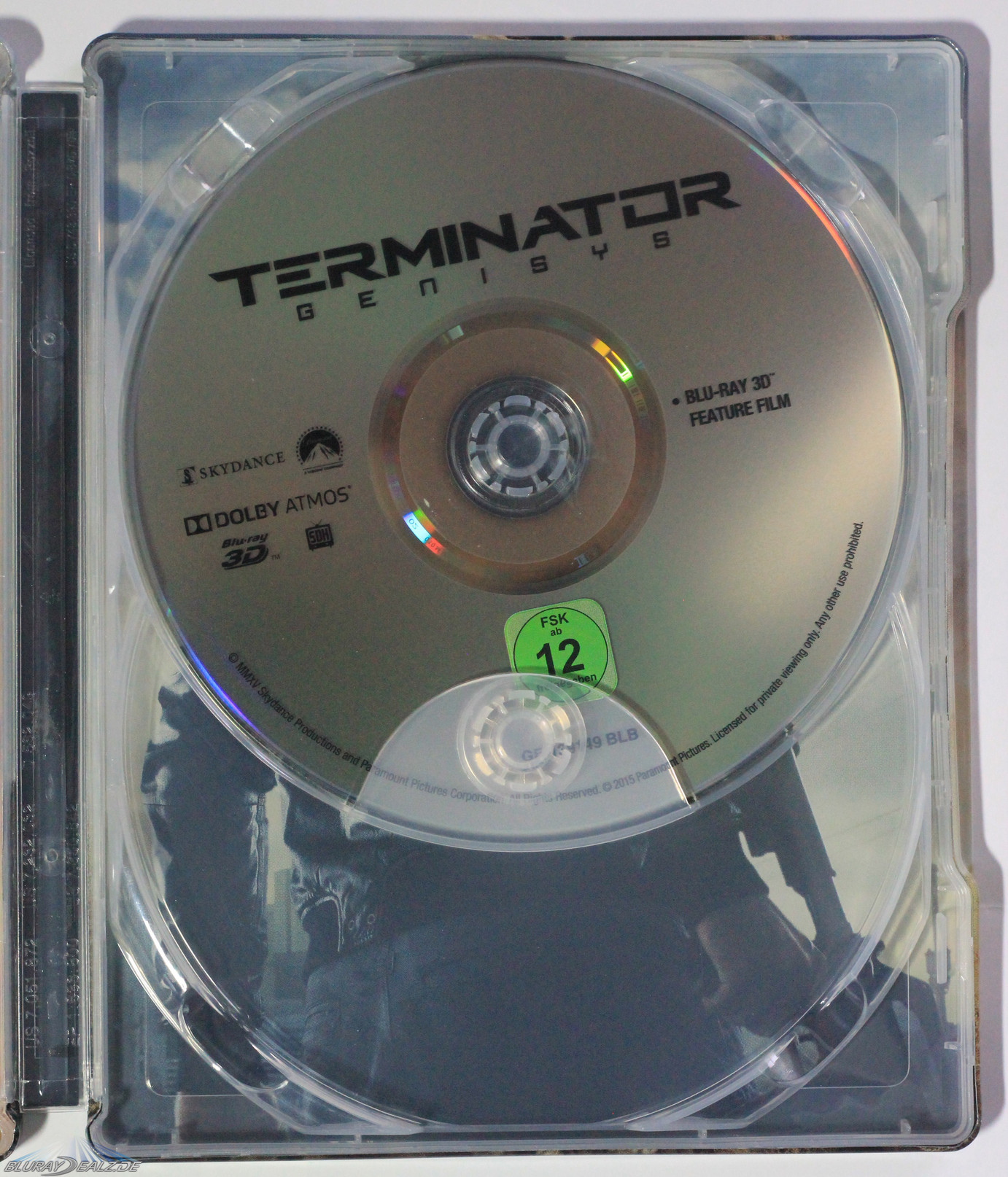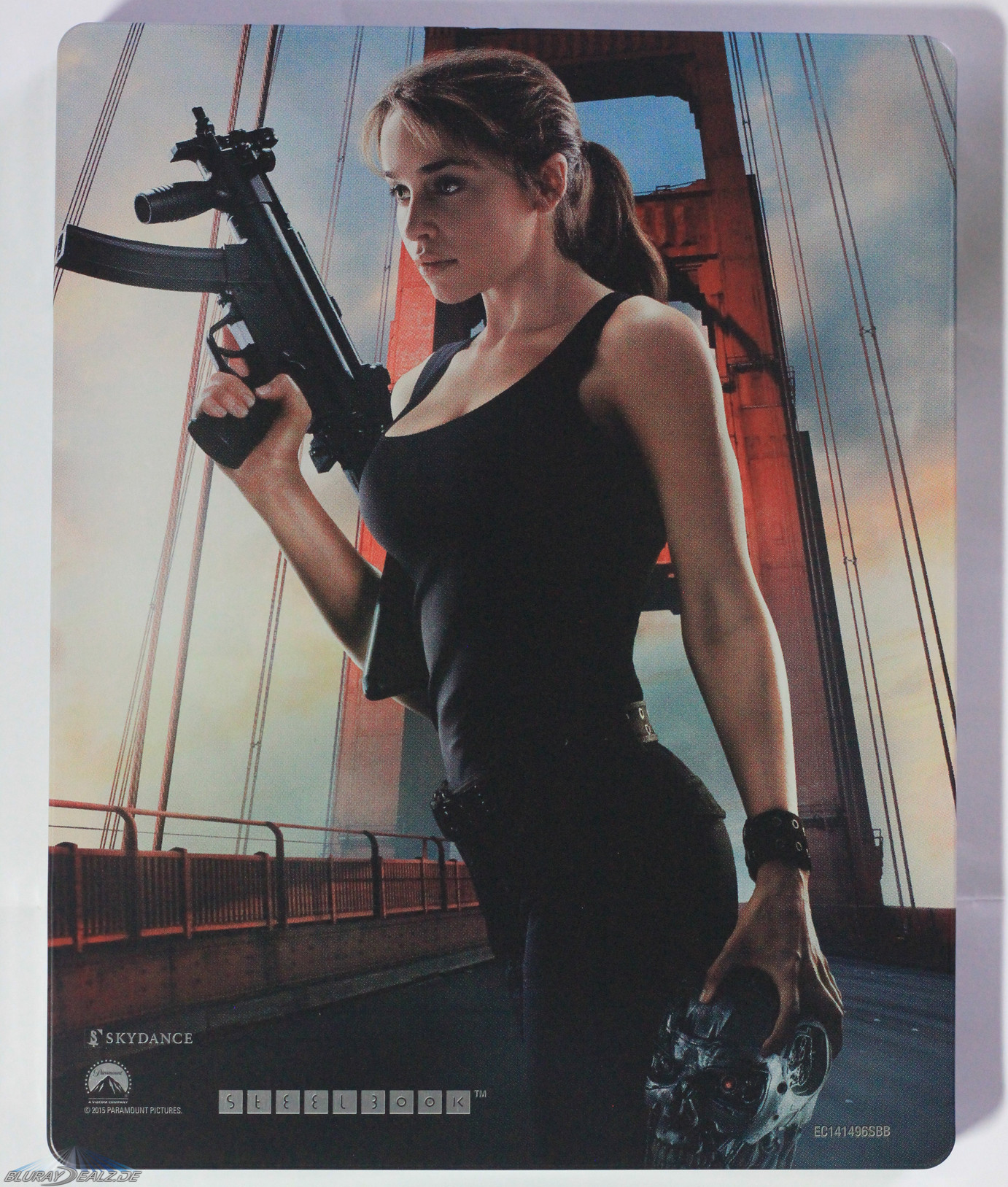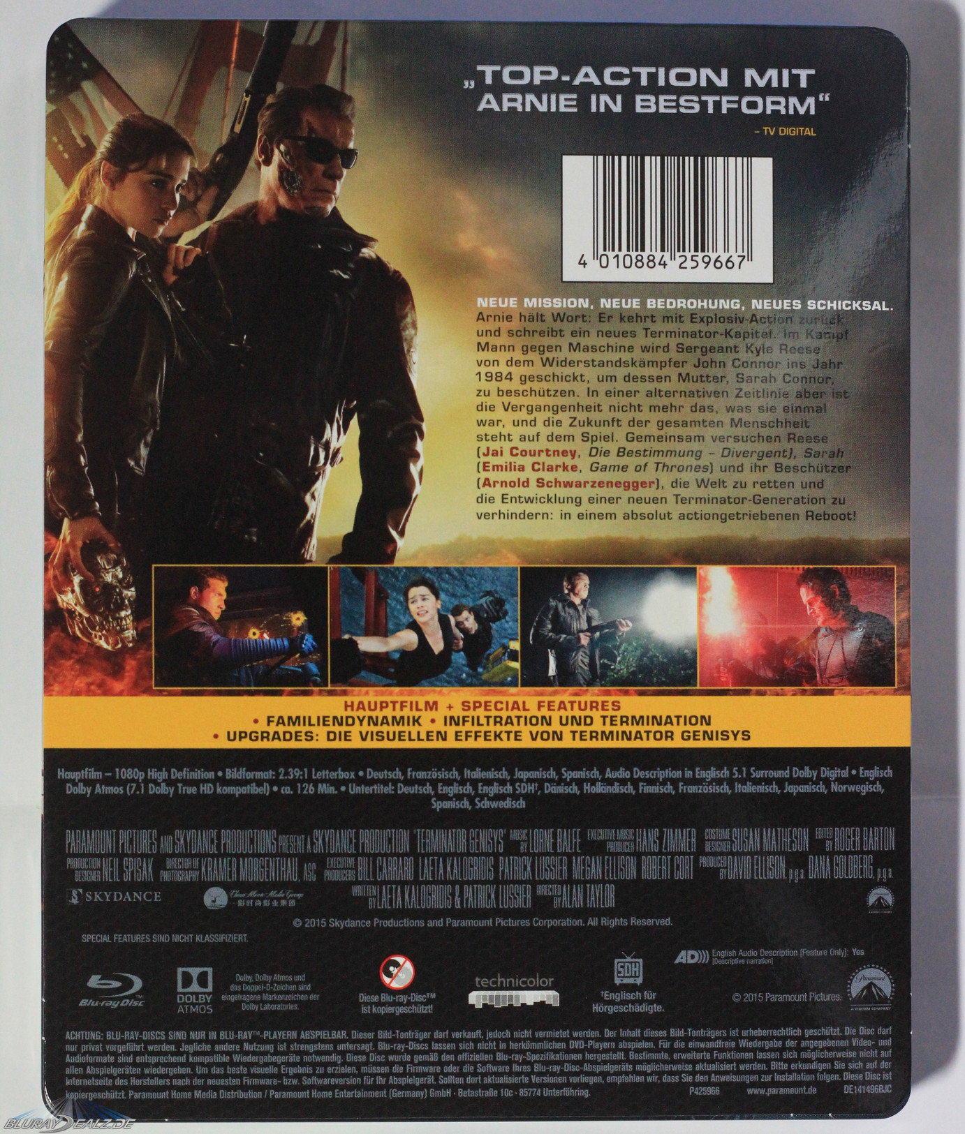 Die Rückseite zeigt Emilia Clarke („Game of Thrones“) alias Sarah Connor den Betrachter über den Rücken hinweg ansehend mit dem Schädel eines Endoskeletts in der einen und eine Shotgun in der anderen Hand. Die Rückseite ist komplett matt gehalten und nur die Studiologos sowie das Steelbook-Logo und die Produktionsnummer am unteren Rand weisen Glanzeffekte auf. Das gewählte Artwork ist top und der Druck ist kräftig und detailliert.