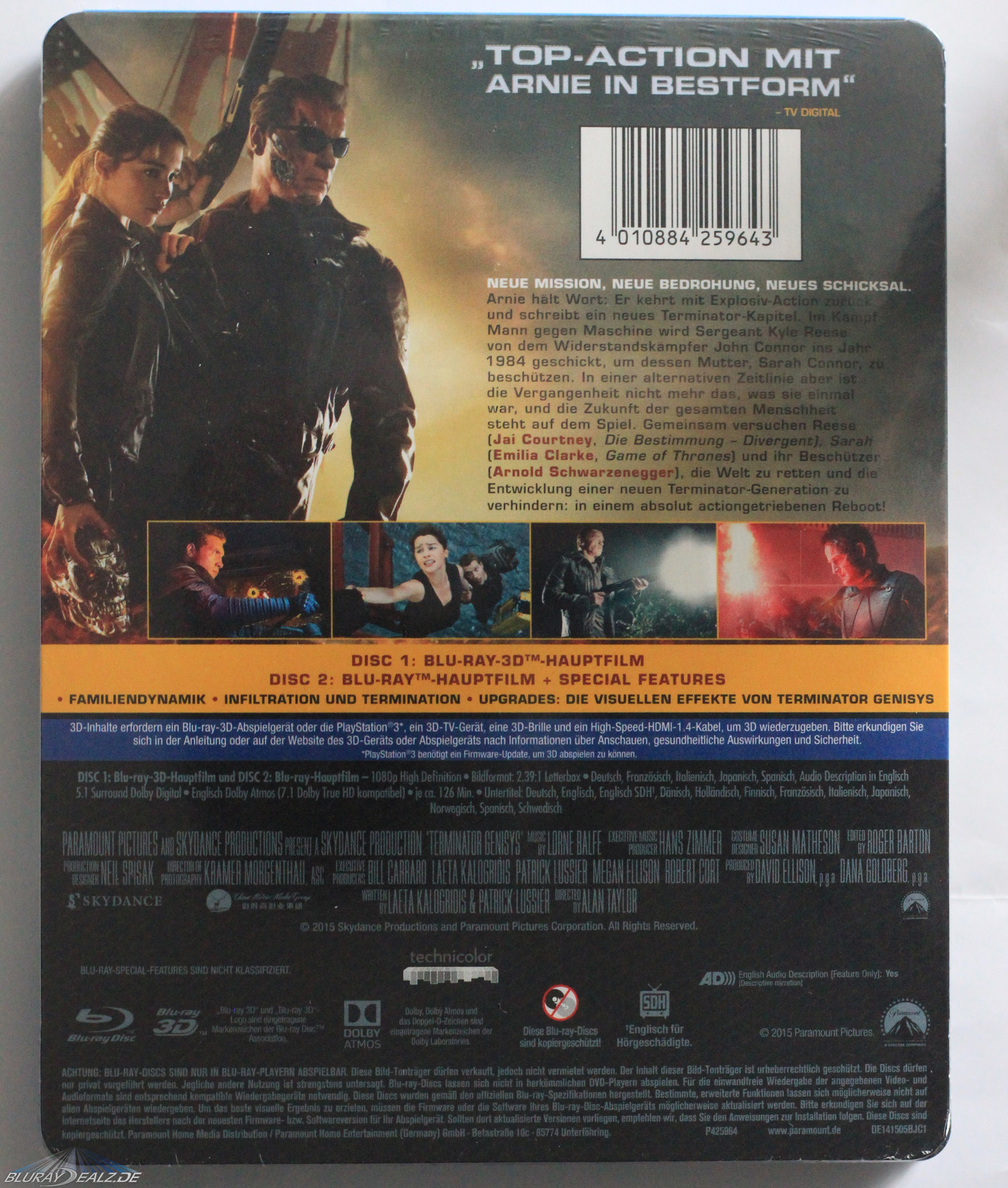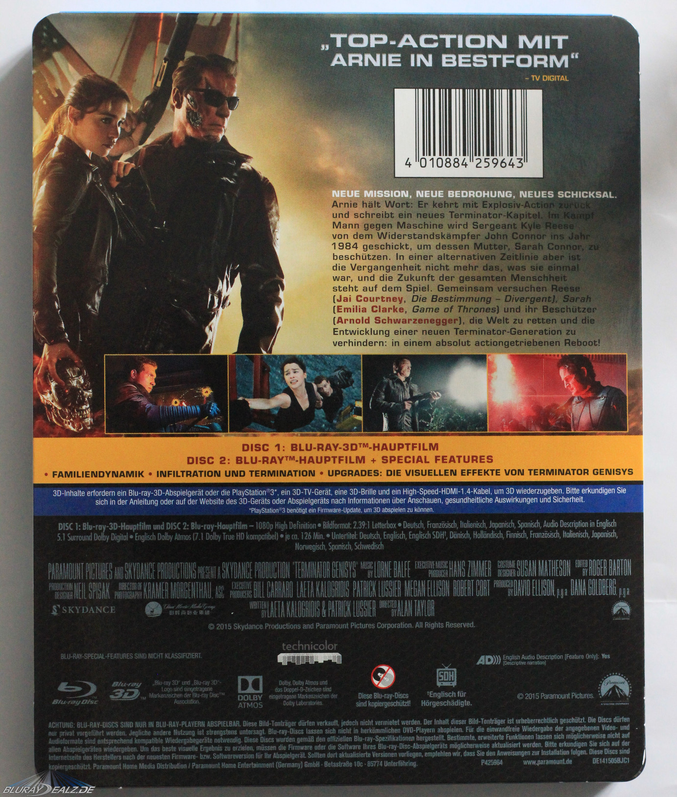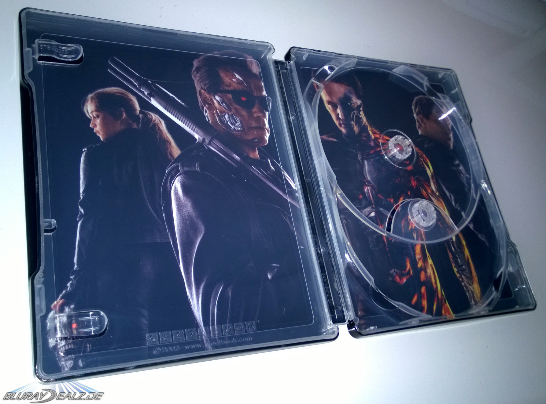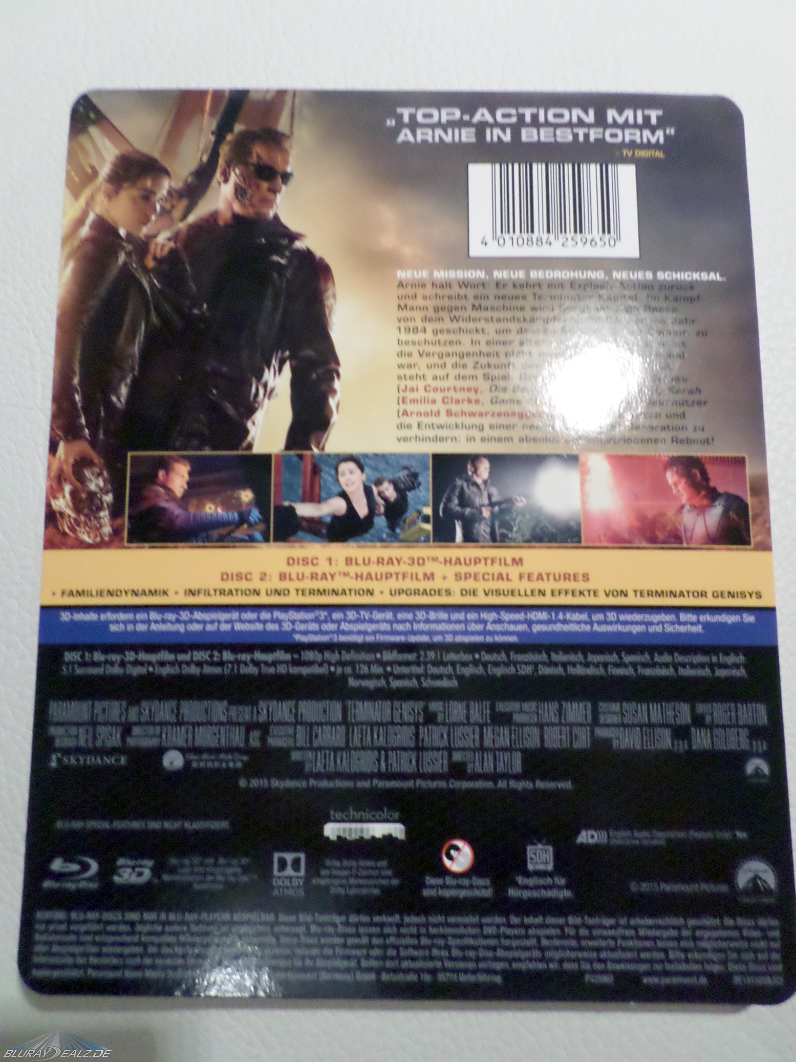 Die Rückseite zeigt Emilia Clarke („Game of Thrones“) alias Sarah Connor den Betrachter über den Rücken hinweg ansehend mit dem Schädel eines Endoskeletts in der einen und eine Shotgun in der anderen Hand. Die Rückseite ist komplett matt gehalten und nur die Studiologos sowie das Steelbook-Logo und die Produktionsnummer am unteren Rand weisen Glanzeffekte auf. Das gewählte Artwork ist top und der Druck ist kräftig und detailliert.