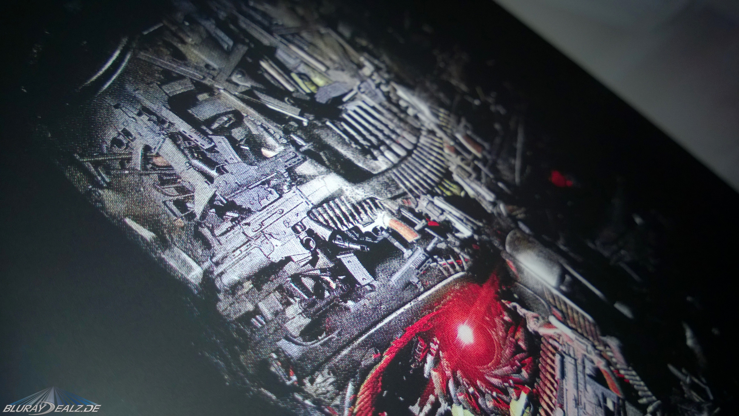 Die Front hat weiterhin einen Rahmenprägung und der Schriftzug „Terminator Genisys“ ist nach außen geprägt. Das Motiv ist glänzend und schimmernd, während der Rest der Front im matten tiefschwarz gehalten ist. Das sieht richtig klasse aus.