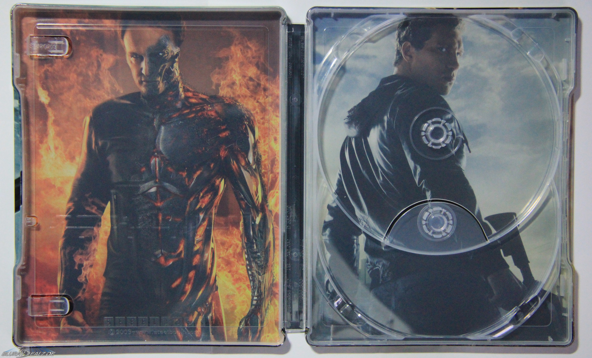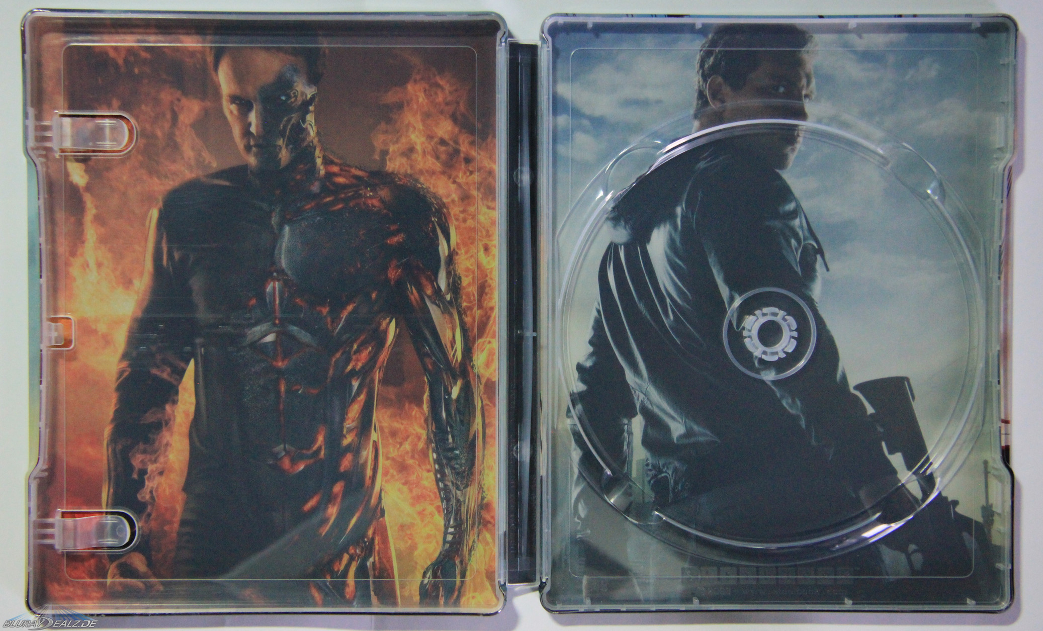 Öffnet man nun das Steelbook, erwartet einen der farbige Innendruck, welcher aus zwei verschiedenen Werbepostern zusammengefügt wurde. Auf der linken Seite sieht man John Connor vor einem in Flammen stehenden Hintergrund, auf der rechten Kyle Reese. Auch hier ist der Druck erfreulich kräftig und detailliert.