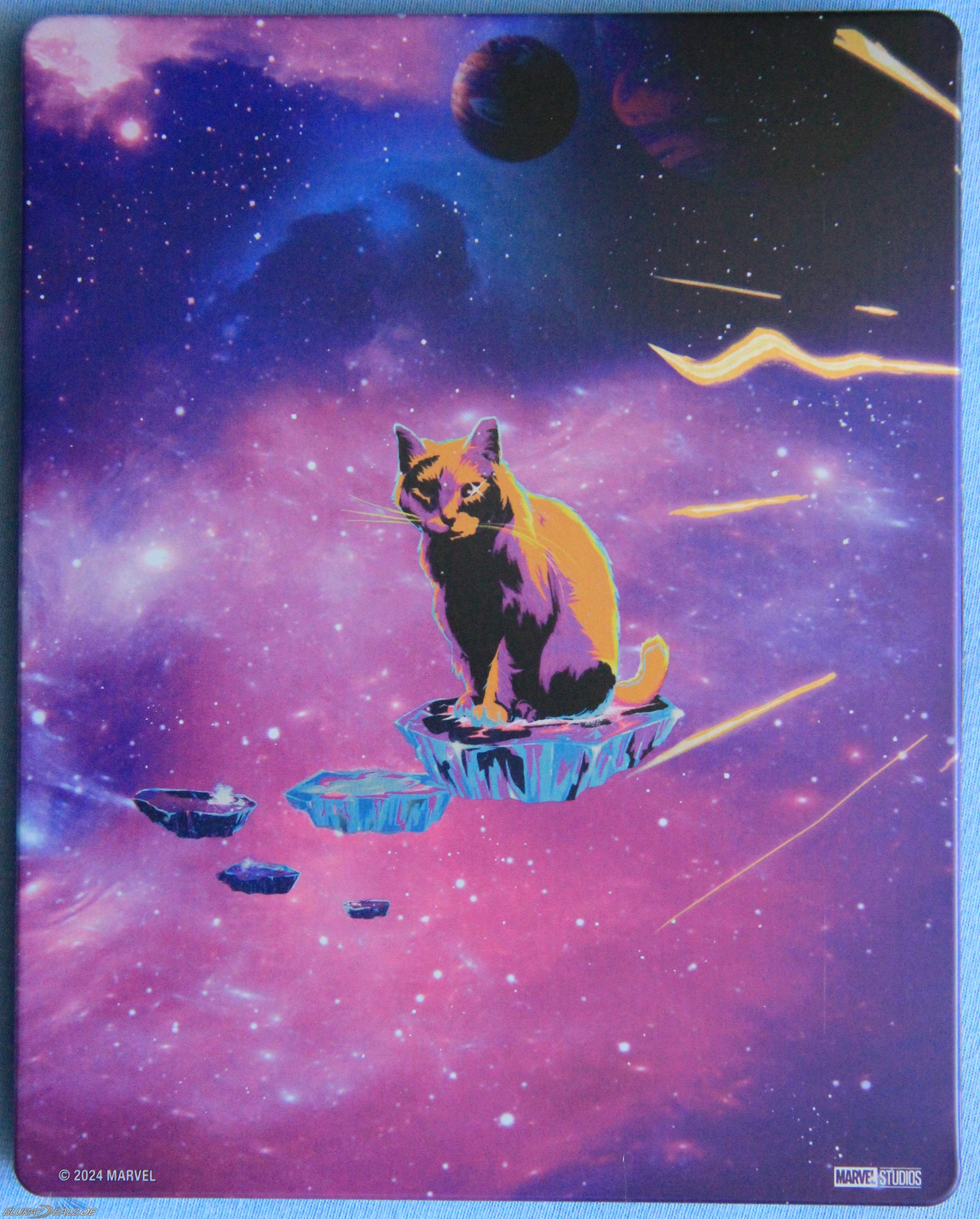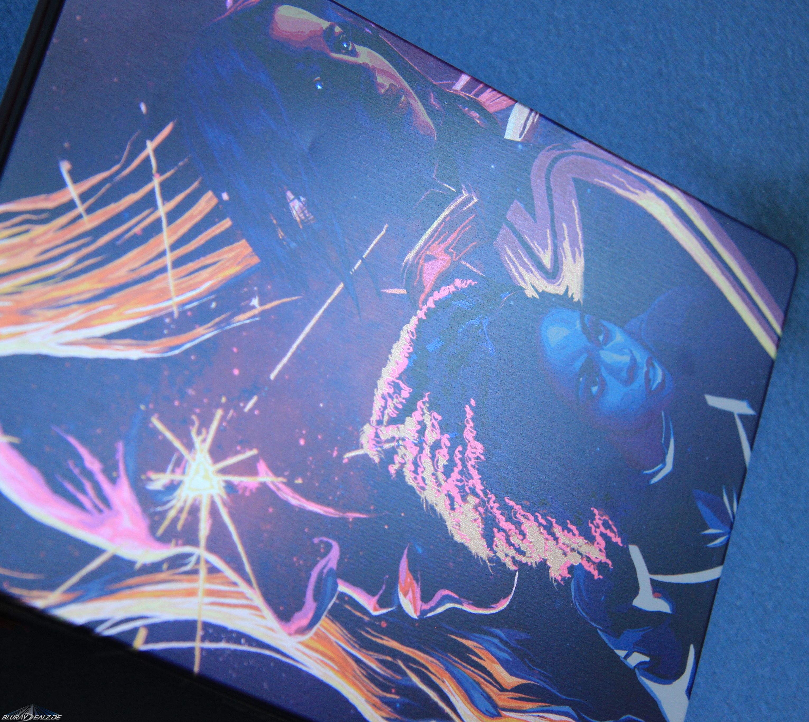 Die Vorderseite zeigt uns die drei Heldinnen aka „The Marvels“ in einem gezeichneten Look, der durch die Inkorporation des Weltraums echt nicht verkehrt wirkt. Das hätte in einem Hochglanz-Finish sicherlich gut zur Geltung kommen können (wie es das in den USA auch tut), aber für Europa gab es nur einen matten Druck, der dem Ganzen viel nimmt und nicht wirklich zum Artwork passen will. Der Druck selbst allerdings ist scharf und detailliert ausgefallen. Dafür haben wir hierzulande auf dem gesamten Artwork verteilte Schimmereffekte zu bewundern, die tatsächlich sehr edel wirken und gut eingesetzt wurden.