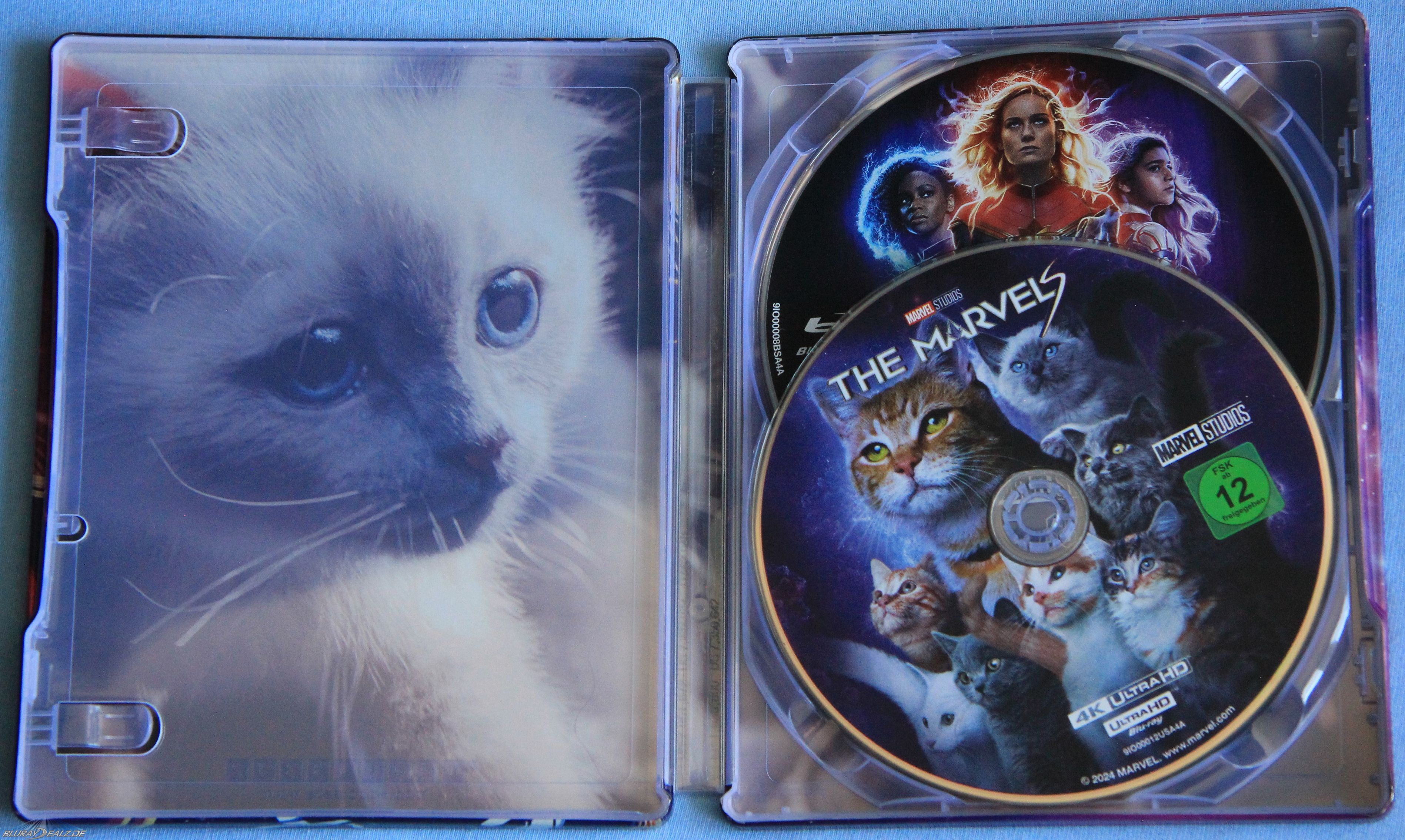 Der Innendruck zeigt ein paar weitere Katzen bzw. Vertreter von Gooses Rasse. Der Druck ist dabei leicht unscharf wie als hätte man einfach einen Screenshot aus dem laufenden Film genommen und ohne weitere Bearbeitung weiterverwendet, denn besonders farbkräftig ist dieser auch nicht gerade. Das ist schade, aber Katzen. So zumindest dürfte sich das Disney gedacht haben. Denn auch bei den Discs finden wir die tatsächlichen Helden des Films auf der 4K-Disc vor, während die Plakatheldinnen die normale Blu-ray zieren. Bedruckte Discs mit verschiedenen Motiven, das gab‘s auch schon länger nicht mehr. Schöne Sache!