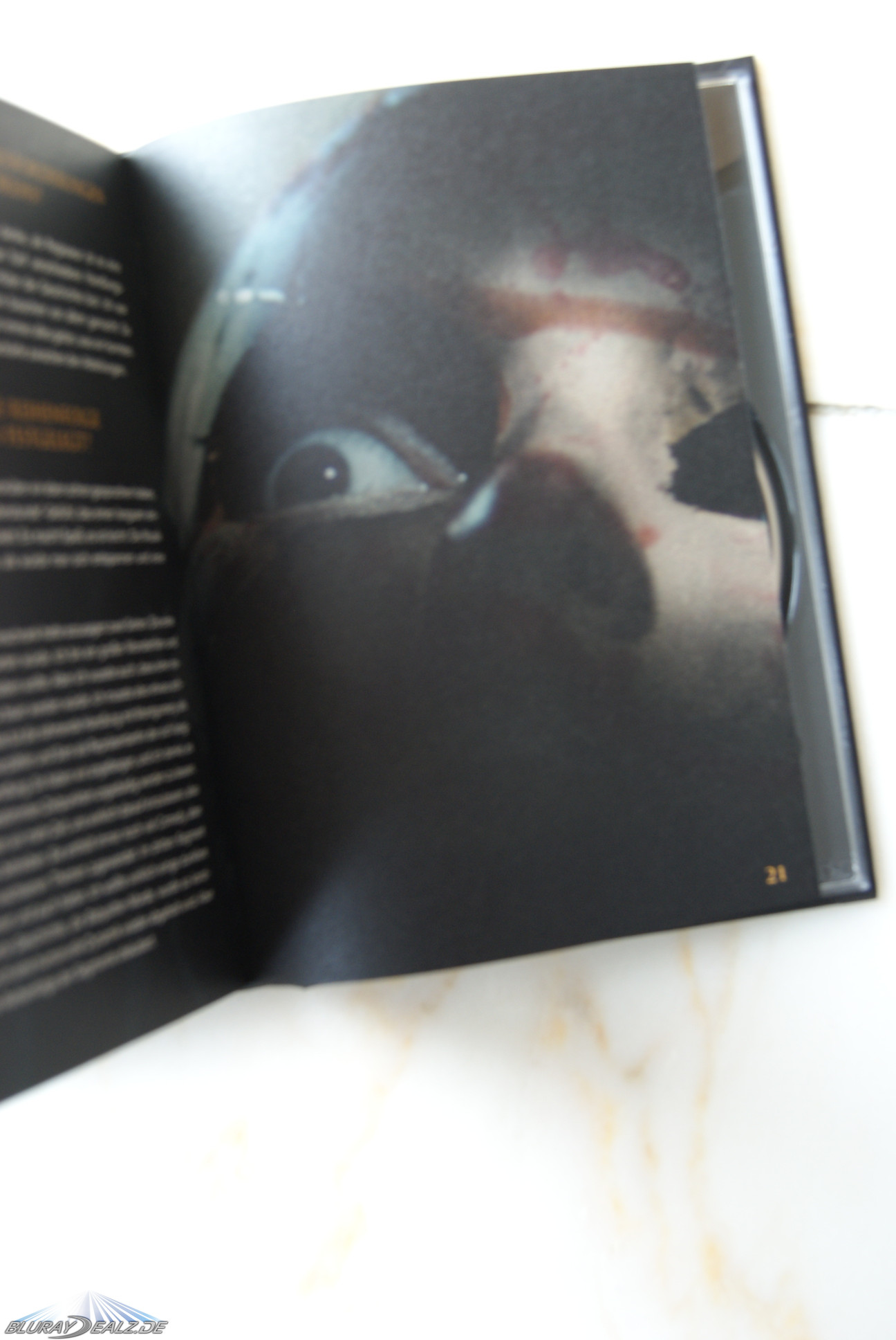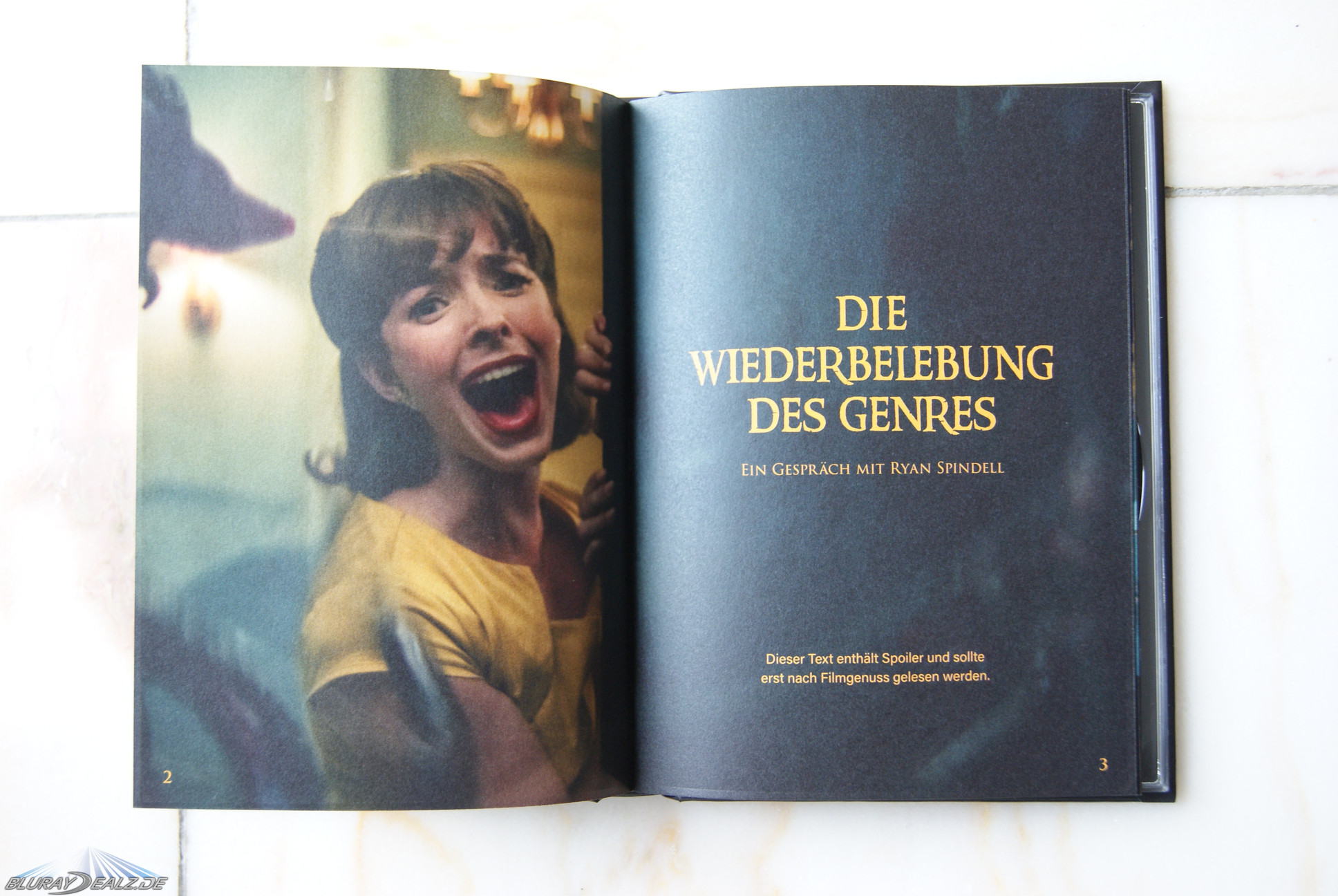 Capelight zeigt hier die typischen Stärken. Die Discs passen sich in den Tray Hintergrund ein. Der Tray-Hintergrund der 4k Blu-ray links und der der Blu-ray rechts ergeben mit der ersten und letzten Booklet-Seite Gesamtmotive. Das Booklet selbstumfasst die gewohnten 24 Seiten und enthält neben vielen Bildern aus dem Film – leider teilweise etwas arg dunkel – ein ausführliches Interview von Deadline-Megazin-Redakteurs Daniel Wagner mit Regisseur Ryan Spindell. Es trägt den bescheidenen Titel „Die Wiederbelebung des Genres“