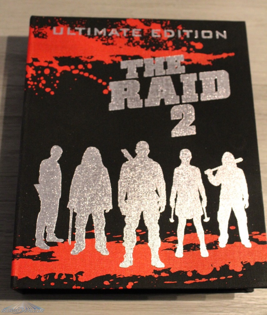 Im Gegensatz zur Ultimate Edition vom ersten Teil ist die zweite Box etwas schmaler ausgefallen. Die Box selber ist so gestaltet, dass es so scheint, als sei Sie mit Stoff bespannt. Die Box ist 20,8 cm hoch, 16,8 cm breit und 4,5 cm tief (Die Box des ersten Teils hat eine Tiefe von kapp 6 cm). Die Box ist in schwarz gehalten und von Blutflecken und Spritzern in Rot durchzogen. Auf dem Cover und dem Rücken befinden sich in Silber gedruckt jeweils der Titel, sowie Schattenbilder der Akteure. Auf der Rückseite ist die Limitierungsnummer in Silber aufgedruckt. In der Box befindet sich ein Digipack mit Schuber, in dem sich 4 Discs finden, die Blu-ray, die DVD, die Bonus DVD und der Soundtrack des Films auf CD.Das war auch beim ersten Teil so, wobei dort noch die umgeschnittene indonesische Fassung jeweils auf Blu-ray und DVD beinhaltet war. Darüber hinaus befinden sich in der Box 6 Postkarten zum Film, ein doppelseitig bedrucktes Filmplakat in A4 und ein 44-seitiges Heft zum Film. Ingesamt fällt der Inhalt etwas geringer aus als bei der ersten Box (6 Discs, Poster A4, 124-seitiger Hardcover Comic, 6 großformatige Postkarten)