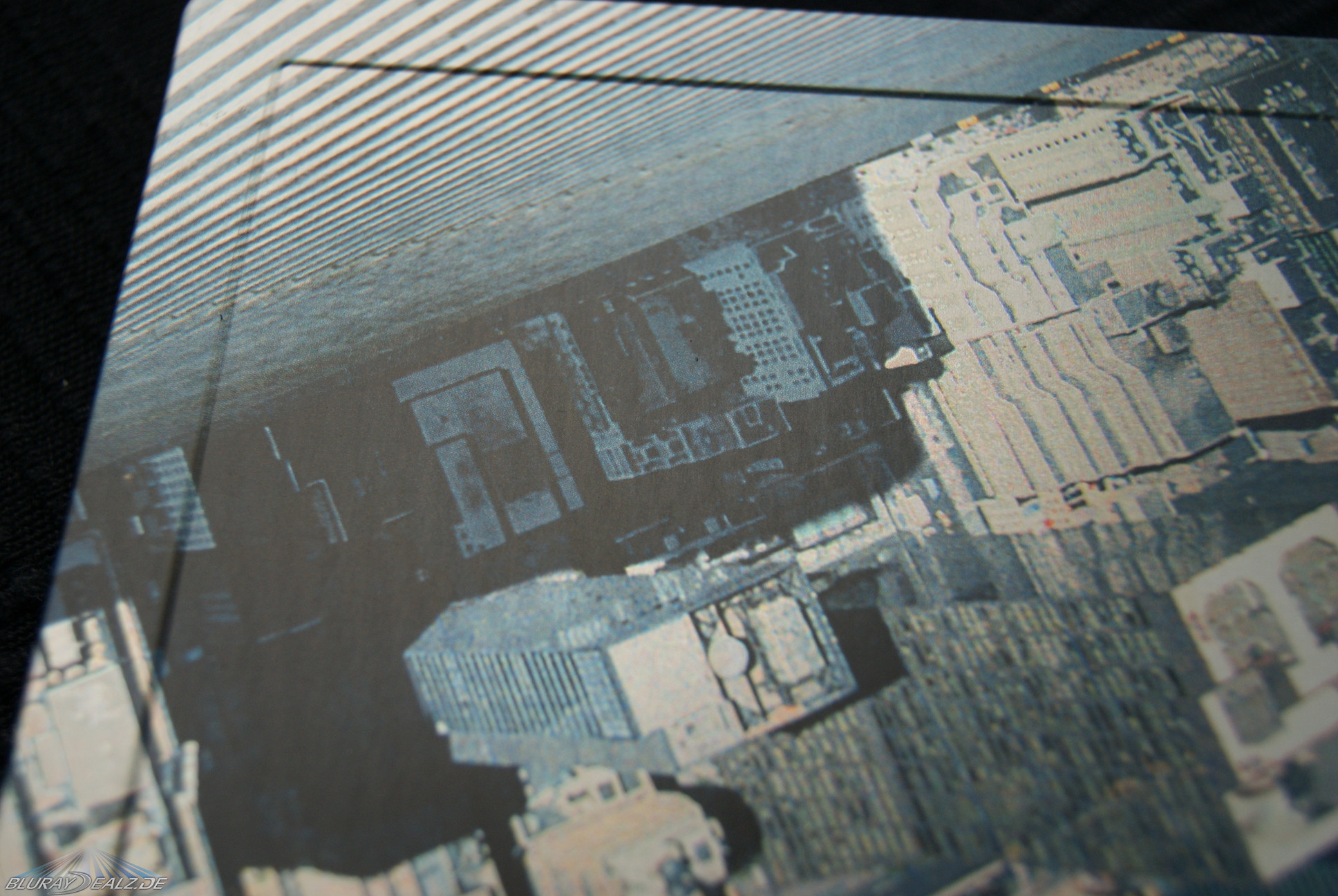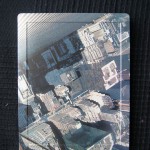 Das Steel hat eine Rahmenprägung, wie es sein muss bei einem Lenticular-Steelbook. Es zeigt wie erwähnt ein anderes Motiv als die Karte. Wir blicken wieder mal von oben auf New York und versuchen dabei, dass es einem nicht schwindelig wird. Kein Text oder Titel stört, der Blick ist frei. Vorherrschende Farben sind blau, grau, silber – die Wolkenkrater schimmern und glänzen. Das Bild lebt im Wechsel des darauf fallenden Lichts. Sehr schön, wenn man sich dabei festhält