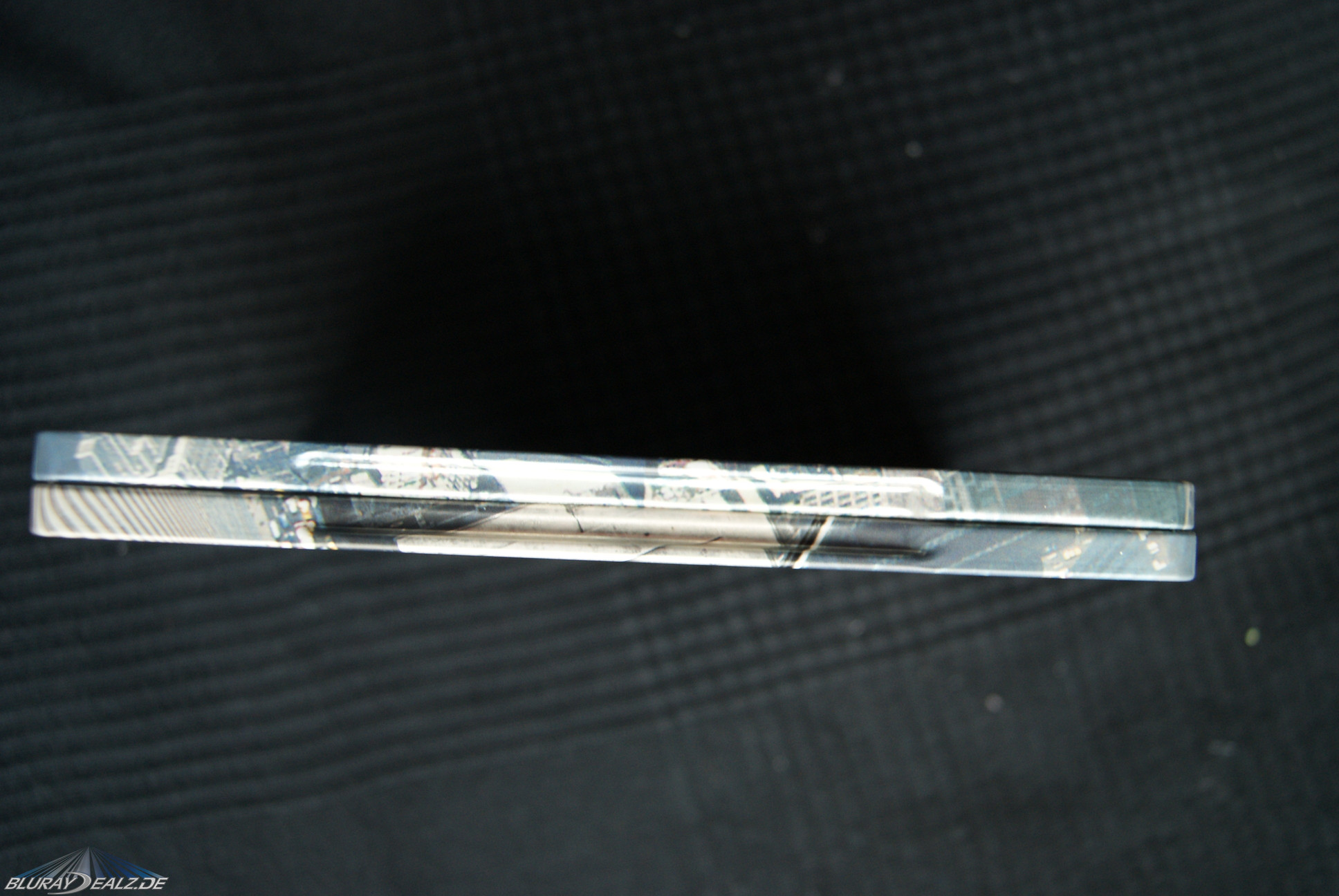 Die Verschluss- sowie die Ober- und Unterseite des Steels führen die Cover fort, was wieder sehr positiv zu vermerken ist. Der Spine ist schwarz, der darauf abgedruckte Titel ist von oben nach unten geschrieben. Darüber befindet sich das Blu-ray-Logo, darunter das von Sony. Leider wurden auf dem Spine die Motive nicht fortgesetzt, was zum einzigen kleinen Wehrmutstropfen führt, denn dadurch wird das geniale Gesamtmotiv, das man erst sieht, wenn man das komplette Steel aufklappt, unterbrochen. Dieses Gesamtmotiv ist der absolute Höhepunkt des Steels. Man scheint etwas über dem Hauptdarsteller zu schweben und hat weit, weit unter sich New York. Sieht wirklich toll aus!