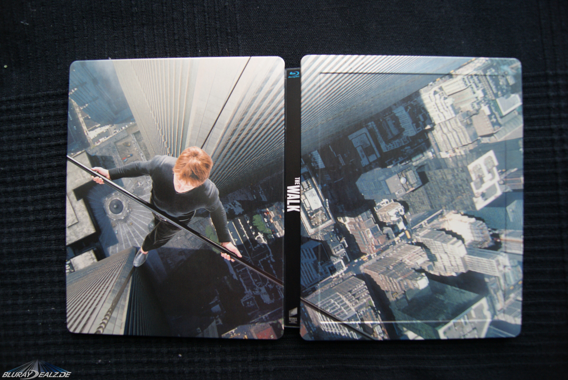 Leidglich die Lenticular-Karte zeigt den Titel des Films „The Walk – Eine wahre Geschichte“ inkl. dem Filmslogan „Jeder Traum beginnt mit einem ersten Schritt“. Das Steelbook bleibt dadurch komplett textfrei!