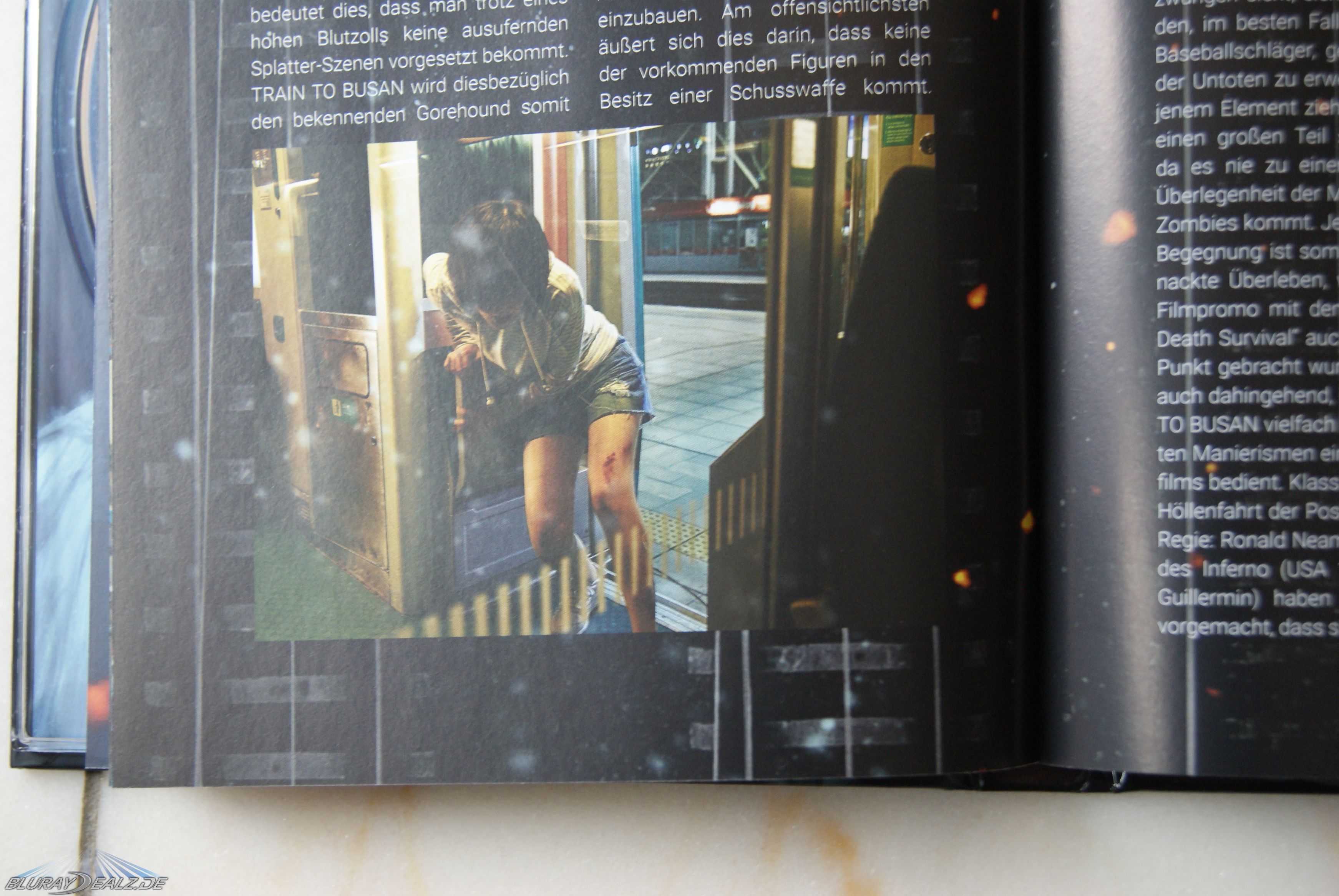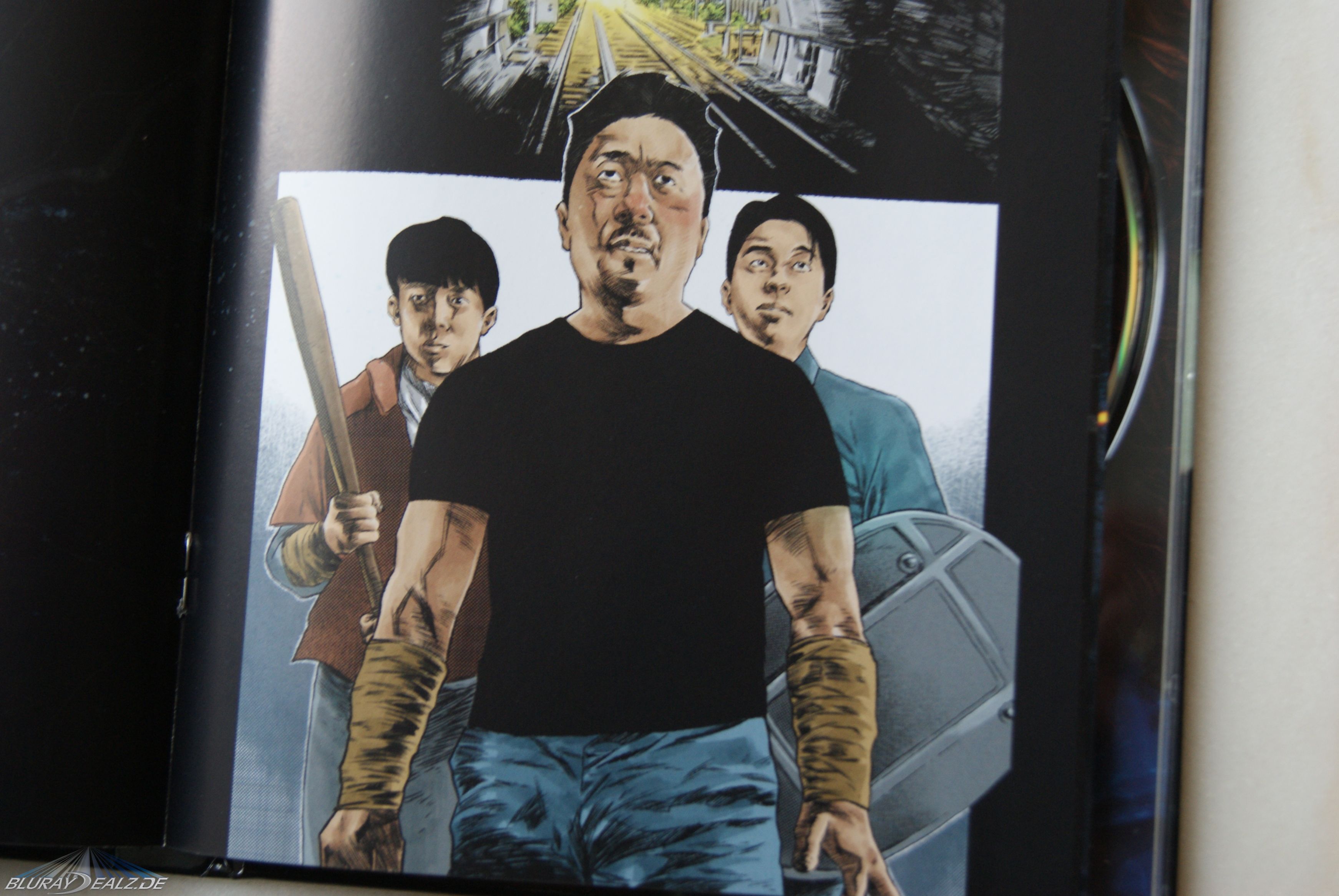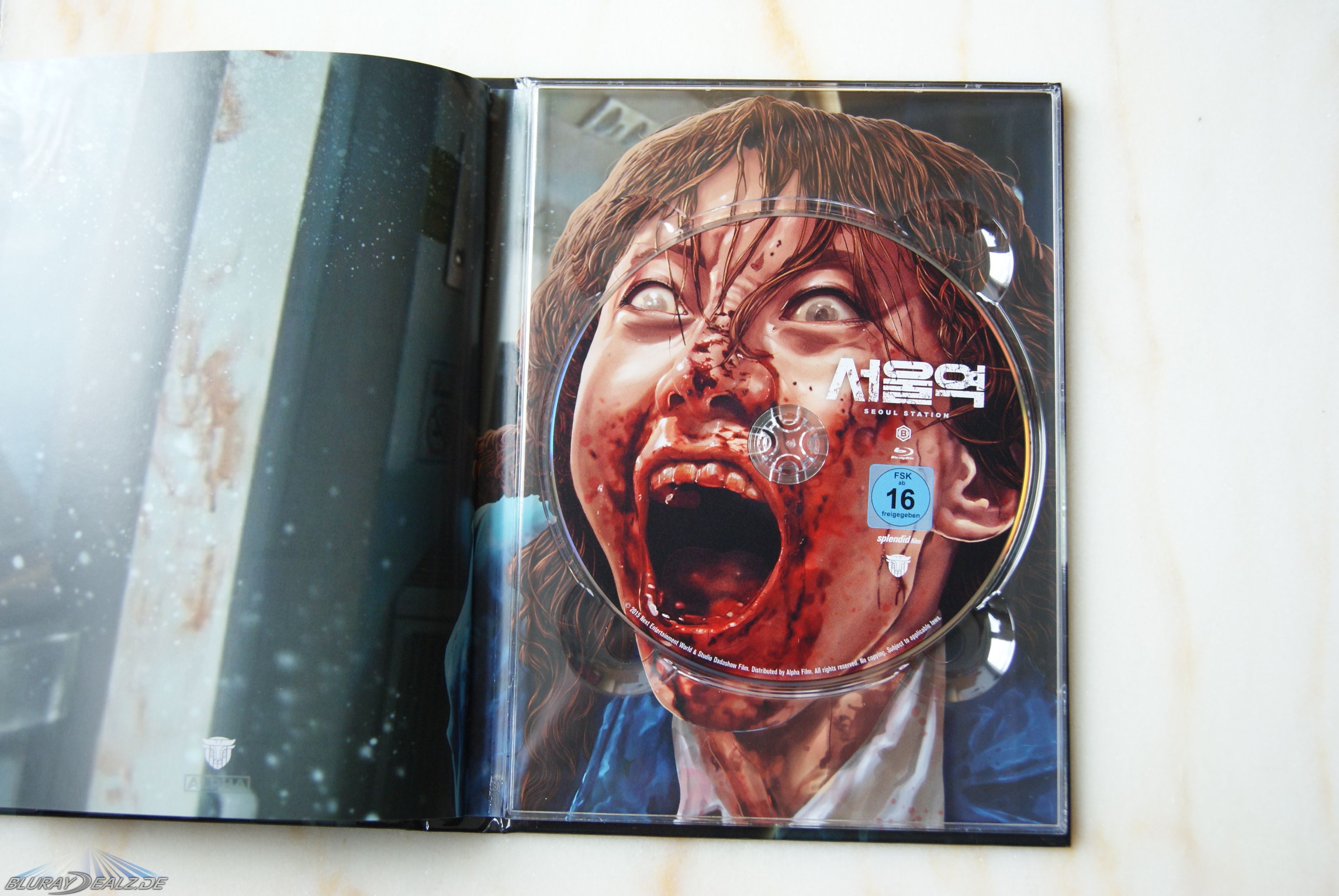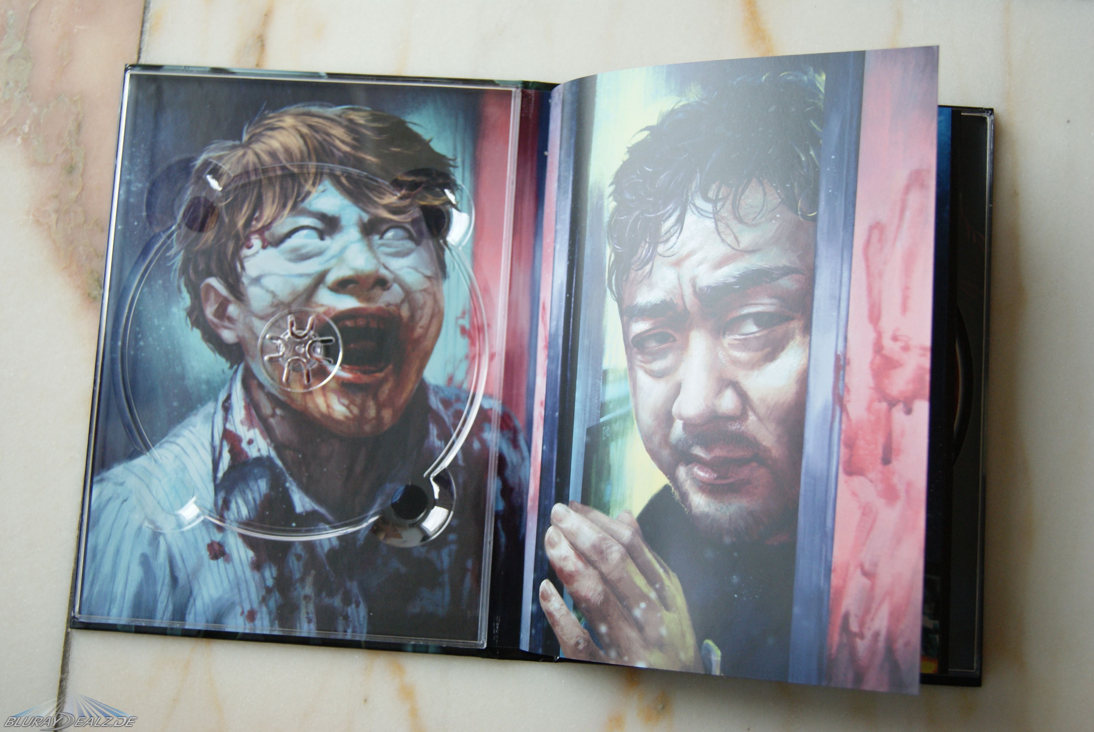 Das Mediabook kommt ohne Flatschen und ohne J-Card. Beides auch nicht notwendig, da es nur online vertrieben wird. Nach dem Entfernen der Einschweißfolie dreht das Mediabook so richtig auf. Die angreifenden Zombiehände, die das durchlaufende Motiv einrahmen sind in Spotgloss und sorgen für einen tollen Effekt. Der Titel steht vorne in Englisch und hinten auf Koreanisch. Wirkt ebenfalls sehr schön. Das Motiv selber zeigt unsere Heldentruppe des Films – wenn auch etwas arg inszeniert – in einem Waggon, den Angriff der Zombies abwartend. Das umlaufende Bild ist hervorragend und passend – es stört nur halt wirklich, dass die Hauptcharaktere hierhin ge“phtoshopped“ wurden und keine realistische Pose einnehmen.