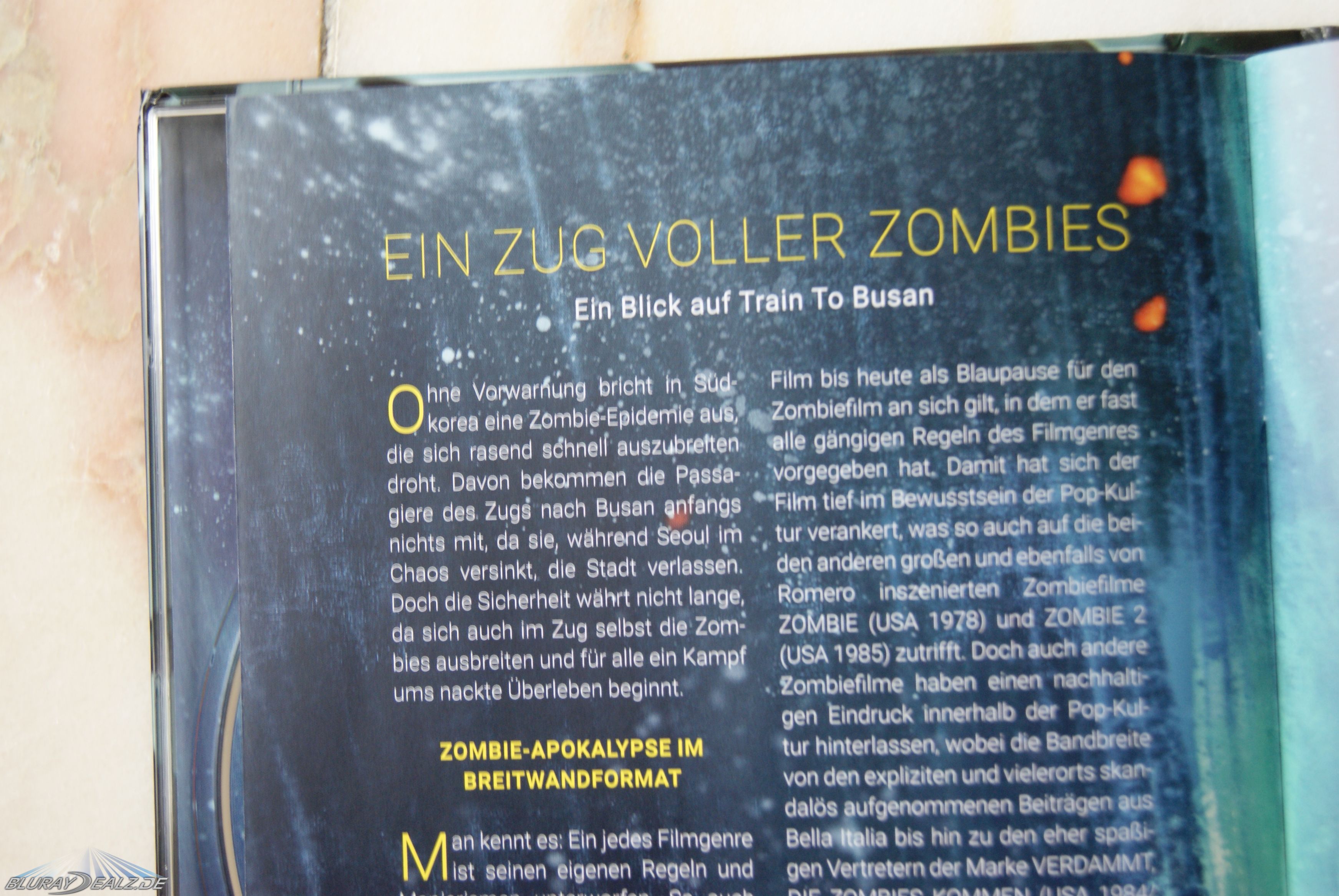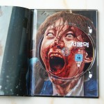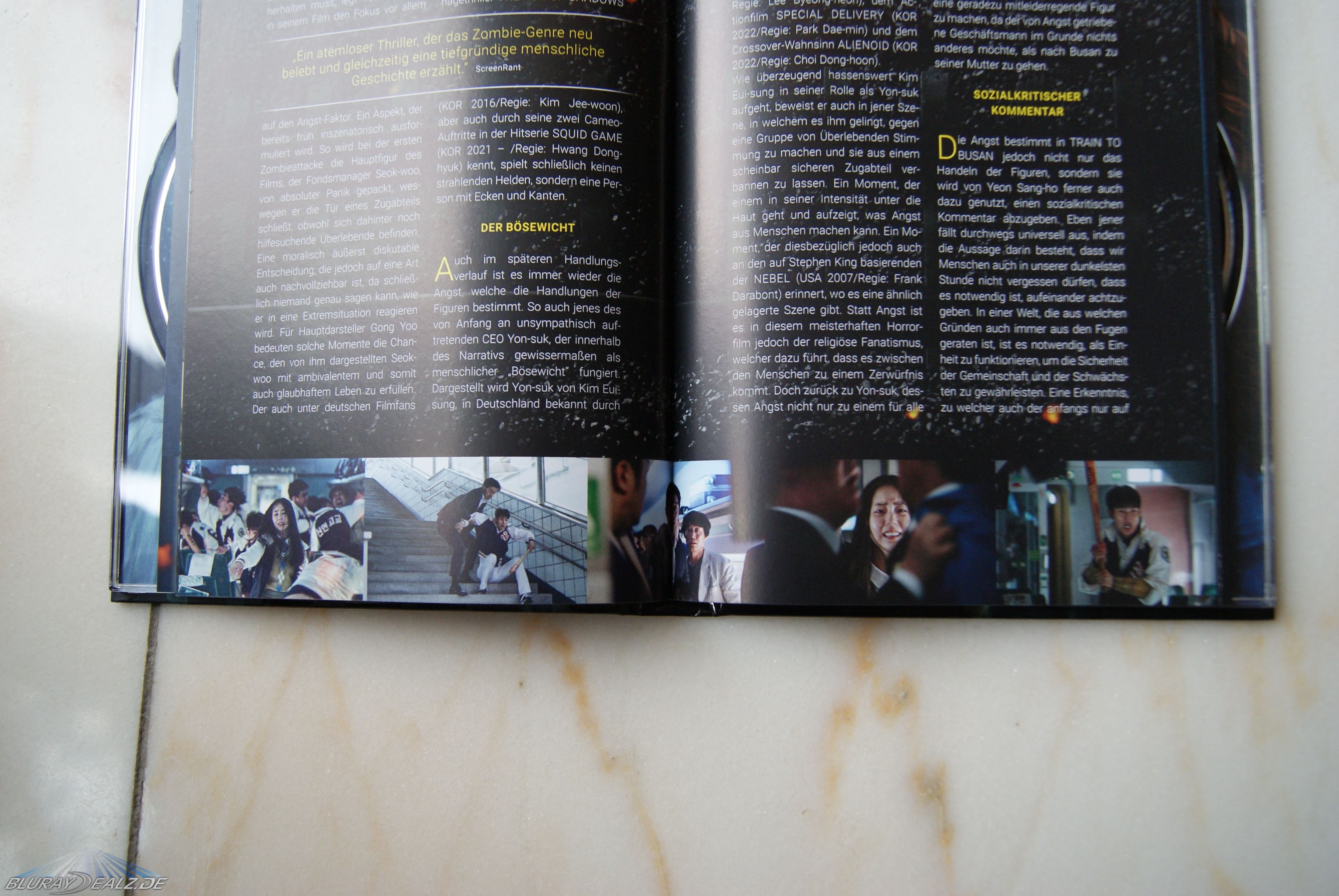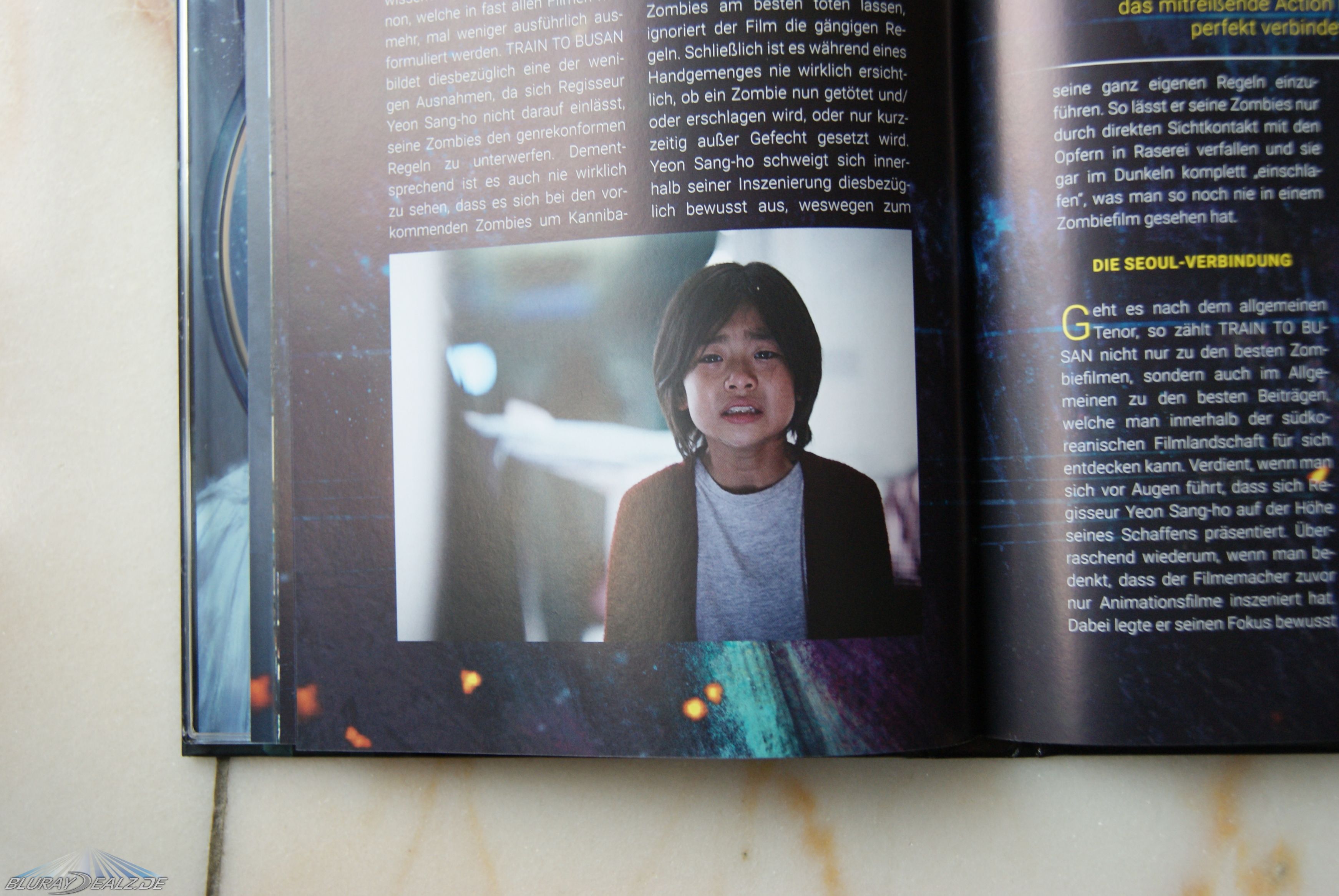 Das Mediabook kommt ohne Flatschen und ohne J-Card. Beides auch nicht notwendig, da es nur online vertrieben wird. Nach dem Entfernen der Einschweißfolie dreht das Mediabook so richtig auf. Die angreifenden Zombiehände, die das durchlaufende Motiv einrahmen sind in Spotgloss und sorgen für einen tollen Effekt. Der Titel steht vorne in Englisch und hinten auf Koreanisch. Wirkt ebenfalls sehr schön. Das Motiv selber zeigt unsere Heldentruppe des Films – wenn auch etwas arg inszeniert – in einem Waggon, den Angriff der Zombies abwartend. Das umlaufende Bild ist hervorragend und passend – es stört nur halt wirklich, dass die Hauptcharaktere hierhin ge“phtoshopped“ wurden und keine realistische Pose einnehmen.