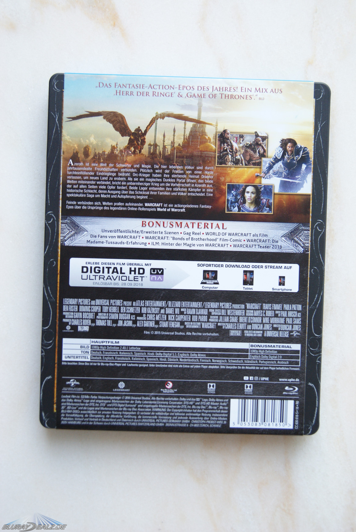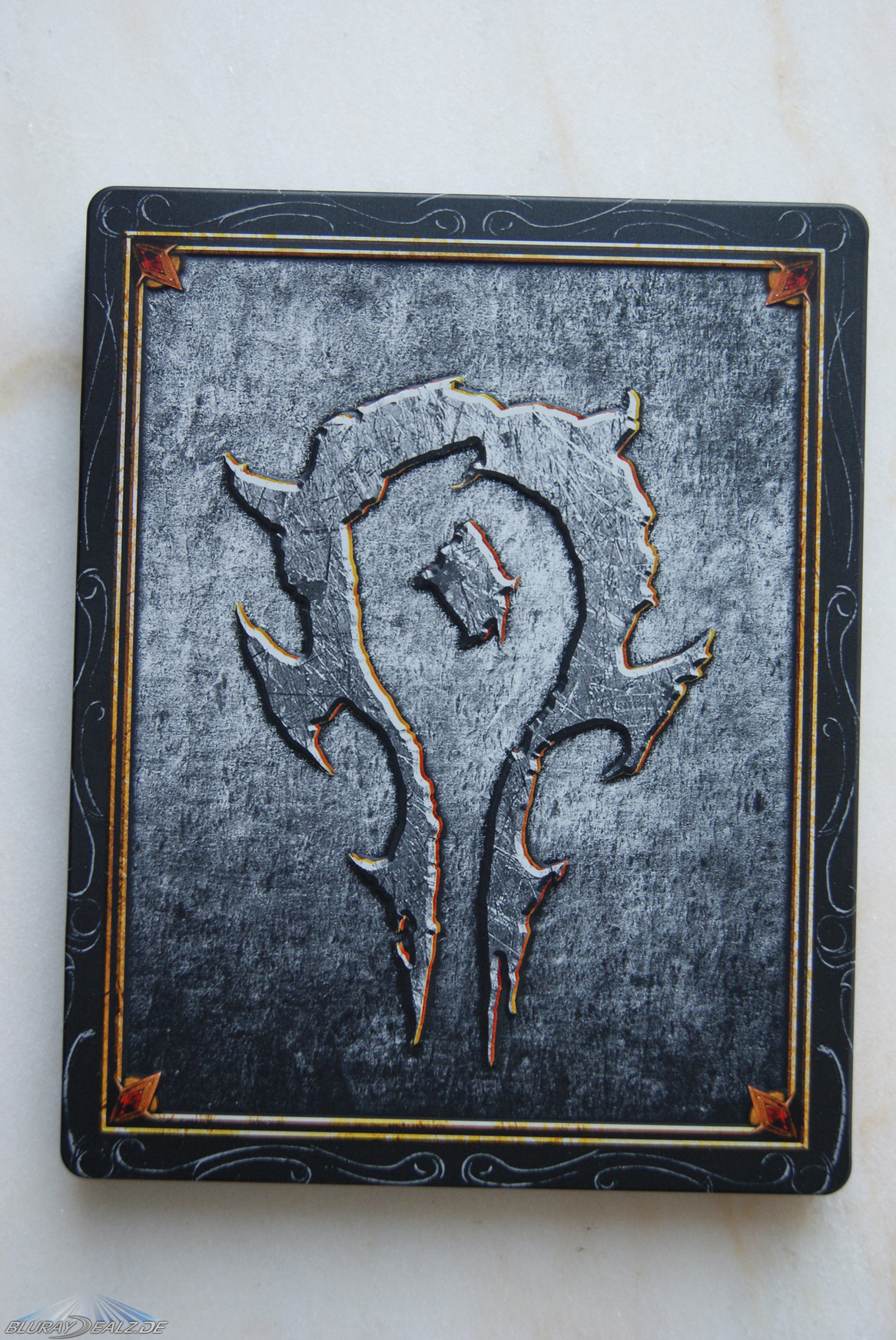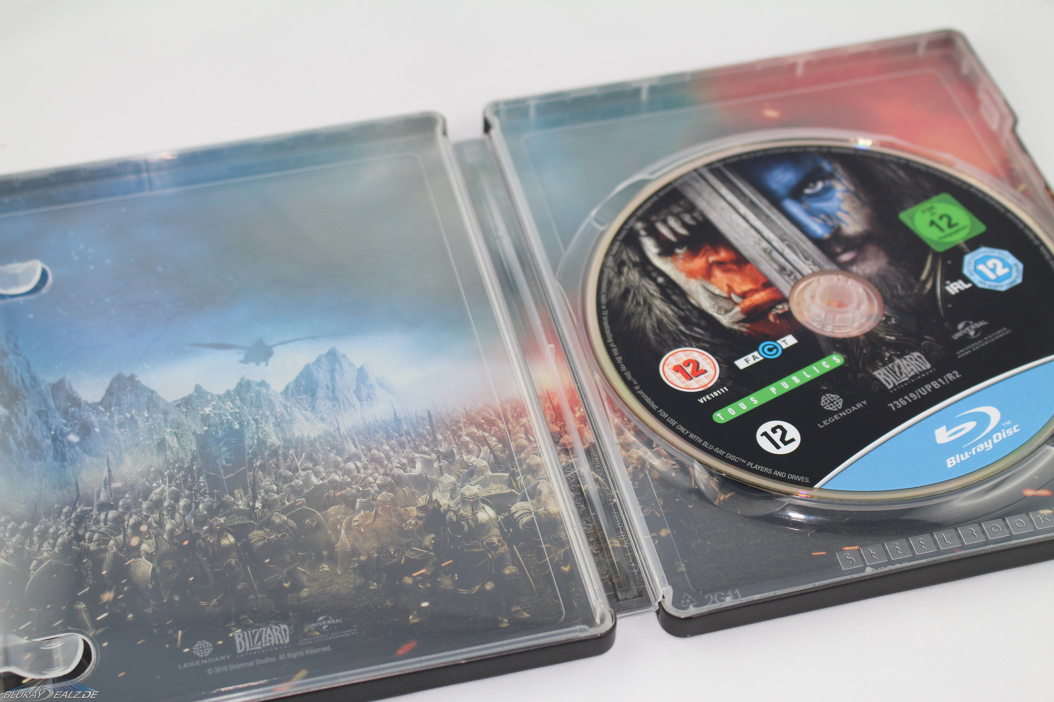 Universal zeigt in schöner Regelmäßigkeit, wie man schicke Steels macht. Zuletzt waren leider nur selten geprägte Exemplare dabei, man überzeugte zuletzt durch schöne, glänzende Cover. Warcraft ist da anders – Es kommt matt daher in einer Granit-Optik und dafür endlich wieder geprägt. Rahmenprägung auf beiden Seiten, auch wenn sie etwas flacher ist als gewöhnlich, und Motivprägungen ebenfalls auf beiden (!) Seiten. Das hatten wir zuletzt bei Ex Machina… Zudem noch ein schöner Innendruck und eine „clevere“ J-Card. Da geht der Daumen hoch.