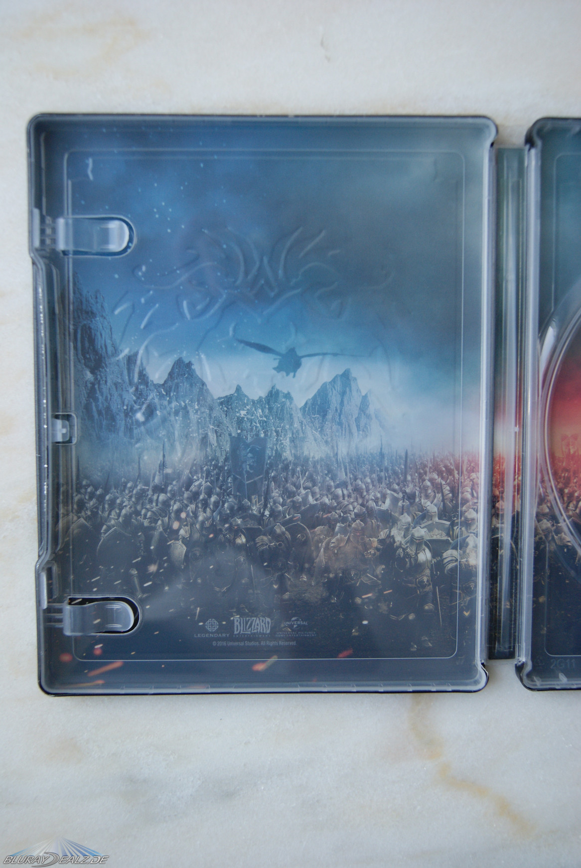Auf der rechten eite befindet sich die Disc, wie man sie auch aus der Keep Case-Veröffentlichung kennt. Links befindet sich ein Flyer mit einigen Blizzard-„Geschenken“. Das Spiel „World of Warcrft“ als Downloadcode für PC und Mac. Ebenso noch gratis-Helden für das Spiel: Gul´Dan und Medivh. Entfernt man Disc und Flyer sieht man den schönen Innenprint. Es zeigt das Heer der Menschen vor der Schlacht mit den Orks. Die bestimmenden Farben sind blau und rot.
