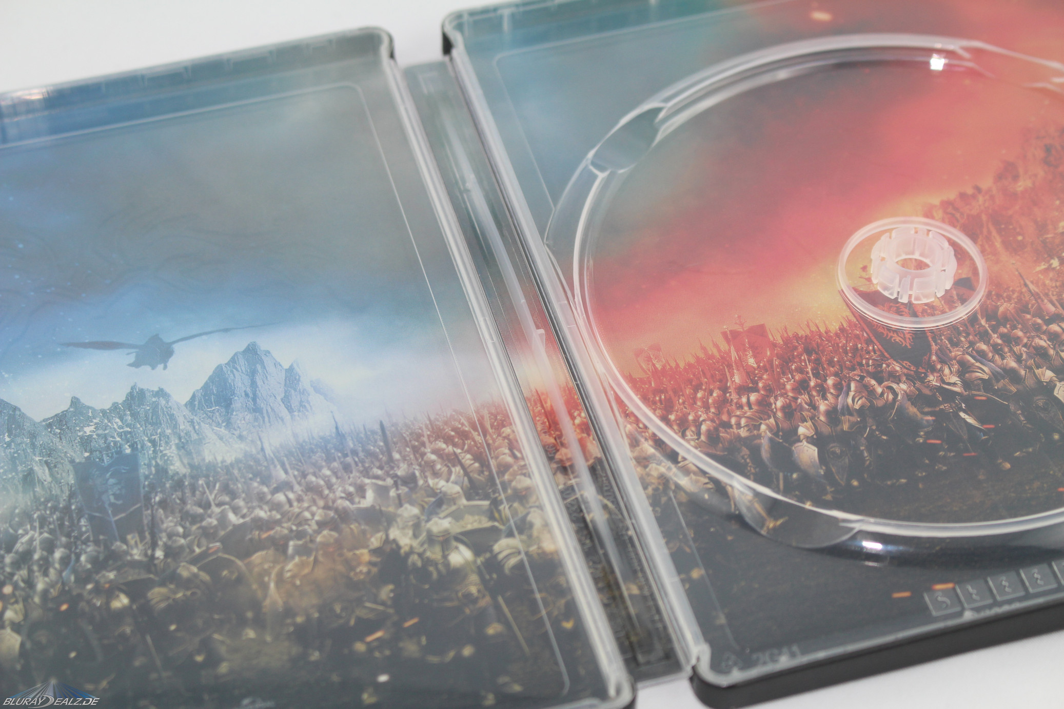 Auch hier geht der Daumen nach oben. Der Steelbook-Fan hat seine helle Freude. Zum einen verfügt die Vorderseite um eine (etwas flachere als gewöhnlich) Rahmenprägung, ebenso ist das Hauptmotiv (Der Löwe, das Zeichen der Allianz) in allen einen Facetten ebenso geprägt. Perfekt. Der Hintergrund ist in schöner Granitoptik, der Rahmen ist dunkel gehalten und verfügt über schöne Verzierungen (dieser wirkt fast wie ein Bilderrahmen). Volle Punktzahl.
