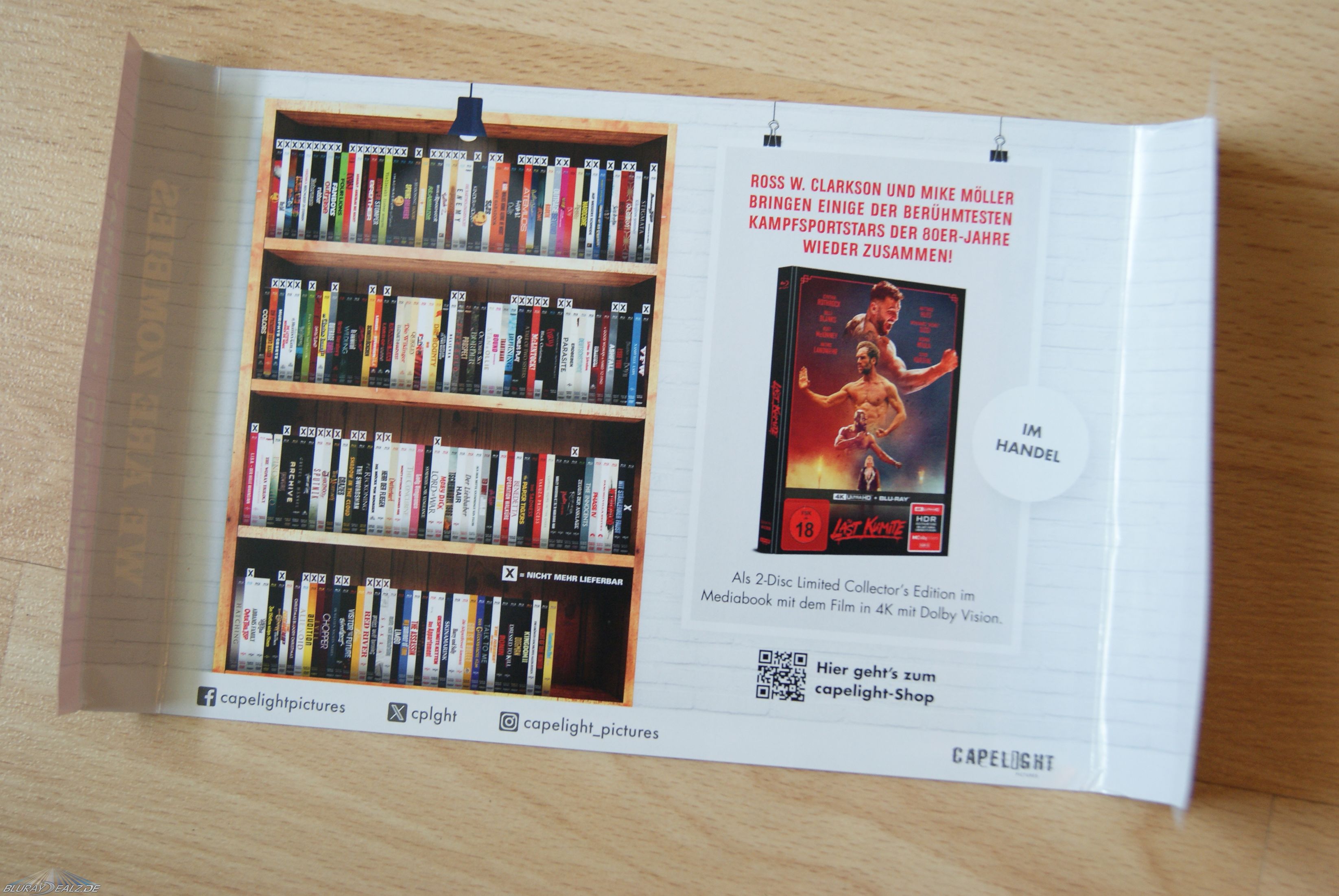 Auch diese VÖ ist von einer lose umliegenden C-Card umgeben, die das Mediabook ääh irgendiwie textfrei… nein, tut sie nicht. Doch dazu später. Auf jeden Fall ist der 4k-Streifen mal in passendem Rot gehalten, der FSK-Flatschen ist hierauf und auf der Rückseite finden sich Angaben zu Inhalt, Specs, Extras (!?) und sonstiges. Da Motiv auf der Vorderseite des matten Mediabooks zeigt prominent den Titel und eine Menge mehr. Da gibt es viel zu gucken, was mit bei Covern immer sehr gefällt. Der Titel auf dem Spine ist wieder groß und leserlich gedruckt und auf der Rückseite finden wir ebenso ein schickes Motiv, nämlich… nein, kein Motiv. Hier tatsächlich Text… Ich finde diesen zwar lustig und passend zum Film, aber ein weiteres Motiv hätte mir besser gefallen.