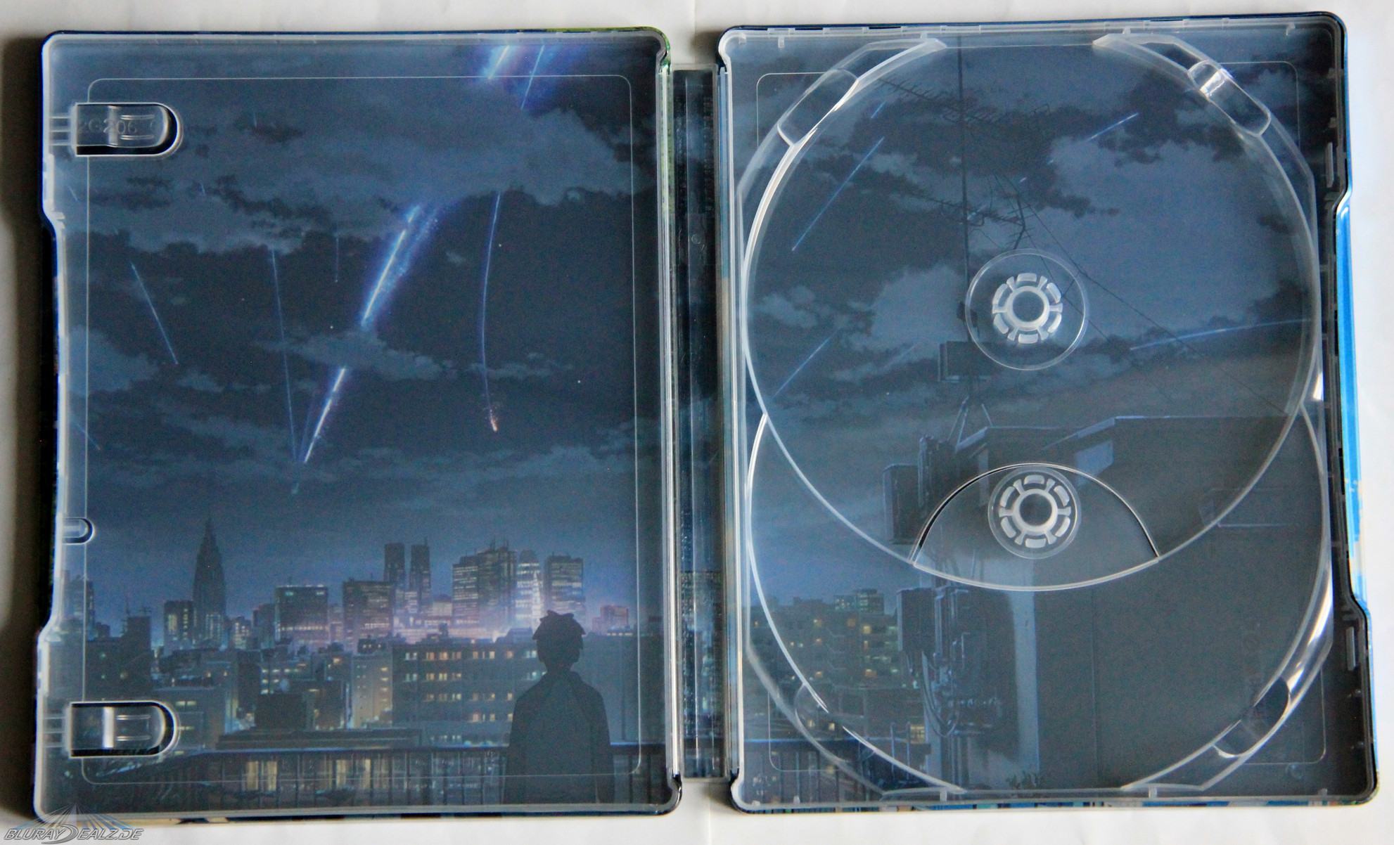 Der Innendruck ist dann ein weiterer Grund zur Freude, gerade im Vergleich zum UK-Steelbook, da Universum das Motiv leicht nach links versetzt hat und so Taki nicht im Spine verschwindet. Ansonsten liegt hier derselbe Innendruck vor, der Taki auf der Dachterrasse zeigt, wie er das Naturschauspiel des herunter stürzenden Kometen beobachtet. Ein sehr gut gewähltes Motiv, welches ebenfalls in bester Druckqualität vorliegt. Top.