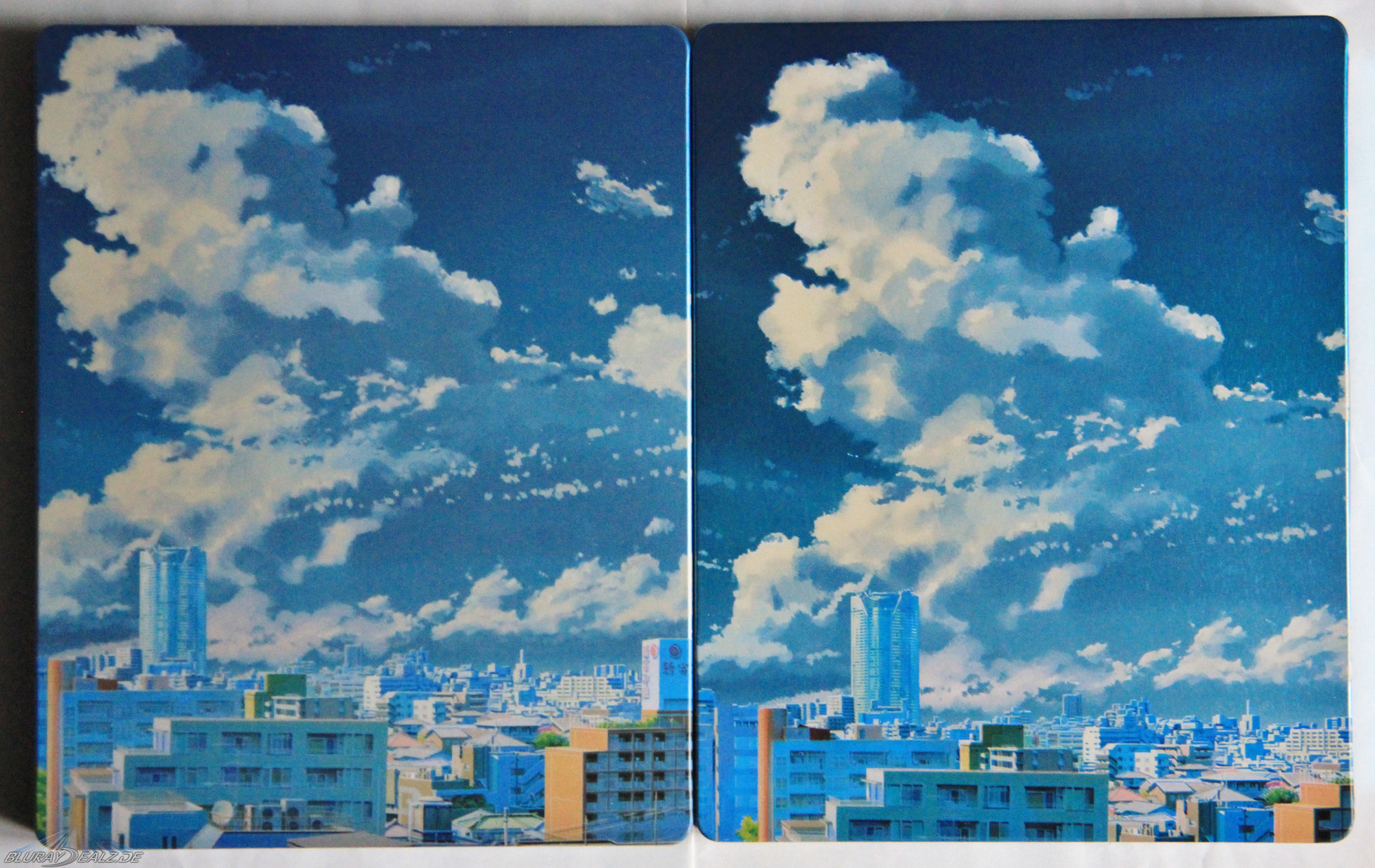 Im Vergleich zum nahezu identisch designten UK-Steelbook fällt hier auf, dass das Motiv ganz leicht versetzt wurde und sich das Finish etwas unterscheidet. Wo bei Universum der komplette Hintergrund den beschriebenen Schimmereffekt aufweist, ist dieser beim UK-Pendant nur in der dritten Ebene (also nur die Stadt, nicht auch die Treppe auf der Taki und Mitsuha stehen) eingesetzt worden. Live wirkt der UK-Schimmereffekt leicht wertiger umgesetzt, dennoch sind beide Varianten absolut gelungen in Szene gesetzt und optisch mehr als ansprechend!