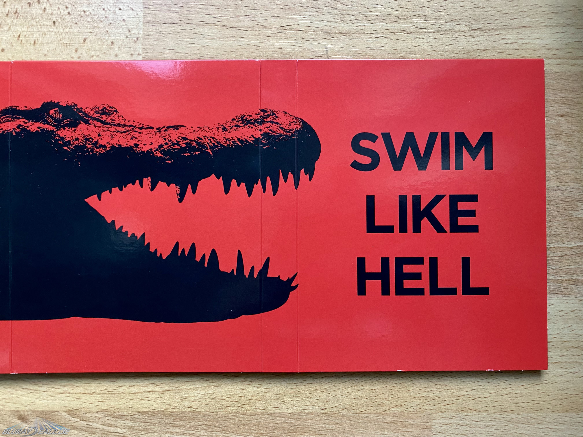 Entnimmt man dem Schuber seinen Innenteil erhält man 4K UHD und Blu-ray angeordnet rechts und links der Goodies. Die Rückseite stellt ein komplettes Krokodil dar in Hochglanz gehalten mit dem Aufdruck „SWIM LIKE HELL“ und ist in rot/schwarz gehalten. Der Innenteil vor dem die beiden Discs angeordnet sind, verfügt ebenfalls über ein Panoramabild in rot/schwarz und zeigt eine Filmszene.