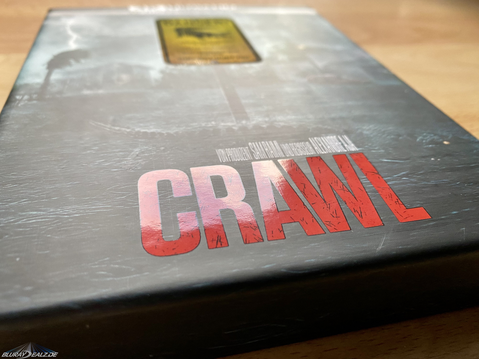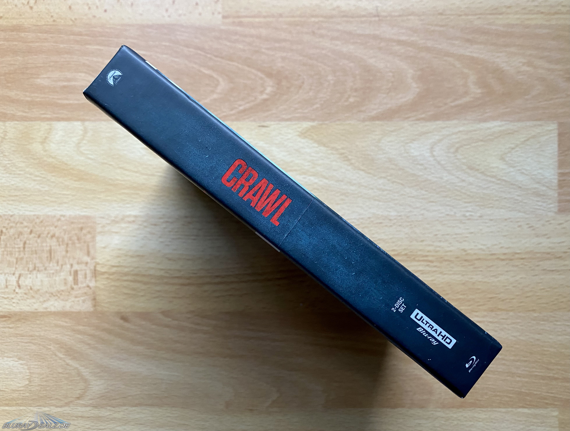Das limitierte Digipack erreichte mich gestern in einem sehr stabilen Schuber, der matt und scharf bedruckt ist. Der Aufkleber „Limited Digipack“ befindet sich auf der Folie, der FSK 16 Aufkleber auf dem Schuber, lässt sich aber problemlos abziehen. Das „DANGER!“ Schild und auch der rote CRAWL Schriftzug auf der Front sind in Spotlack gedruckt und auch die Schrift auf dem Spine. Es gibt leider keine J-card, somit ist das 4K UHD Logo oben auf die Front gedruckt und alle technischen Angaben sind auf der komplett matt gehaltenen Rückseite zu lesen.