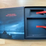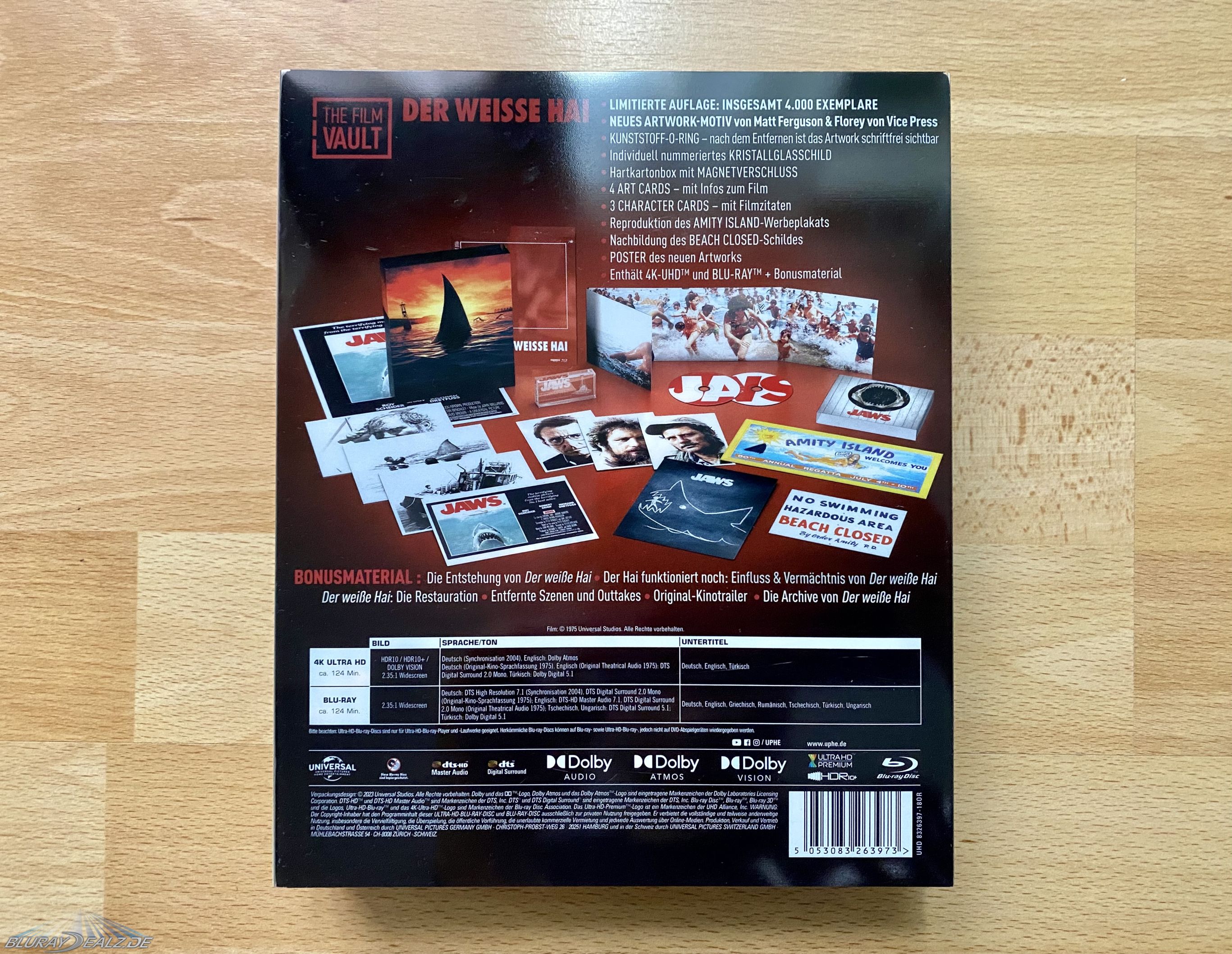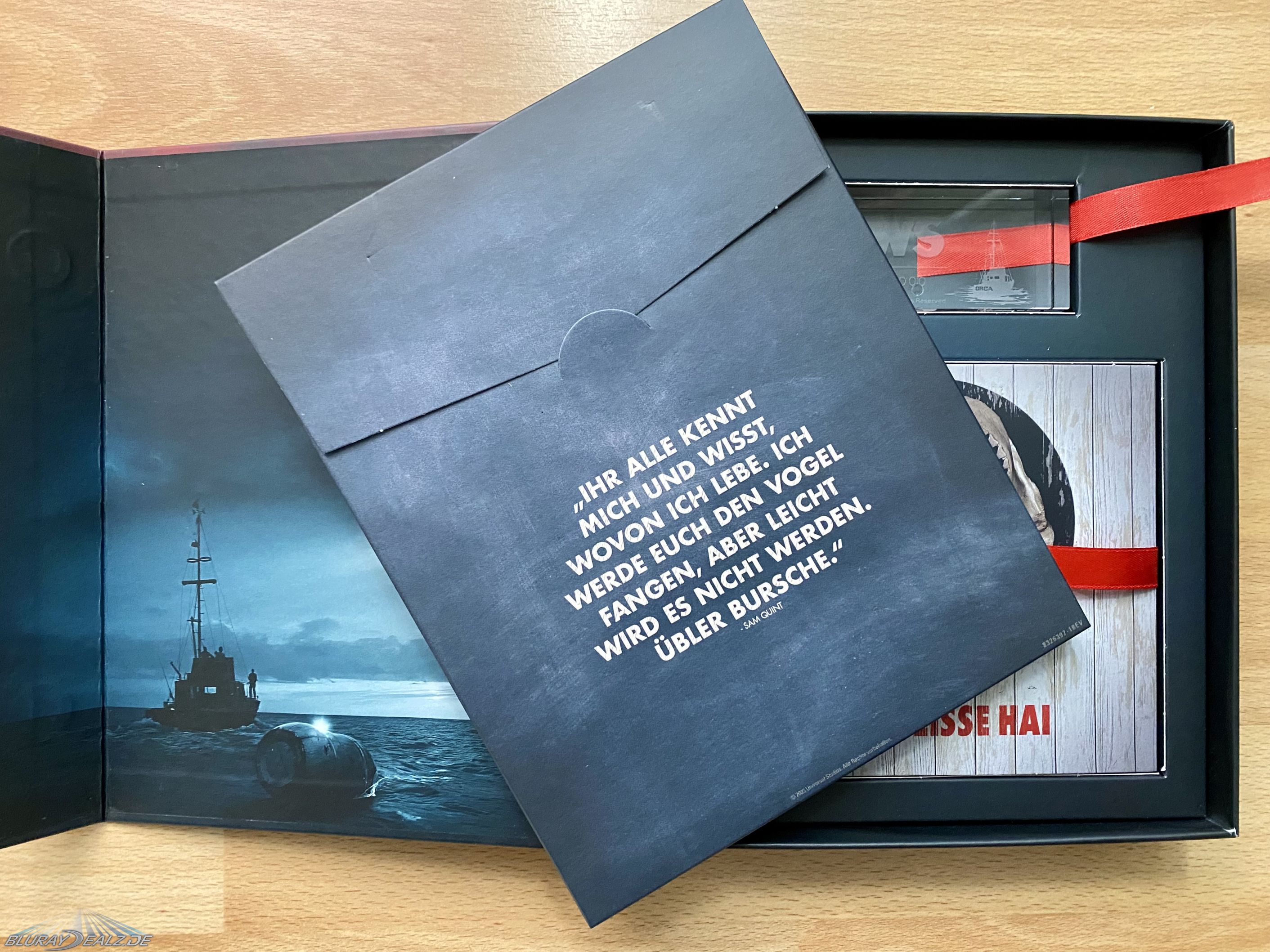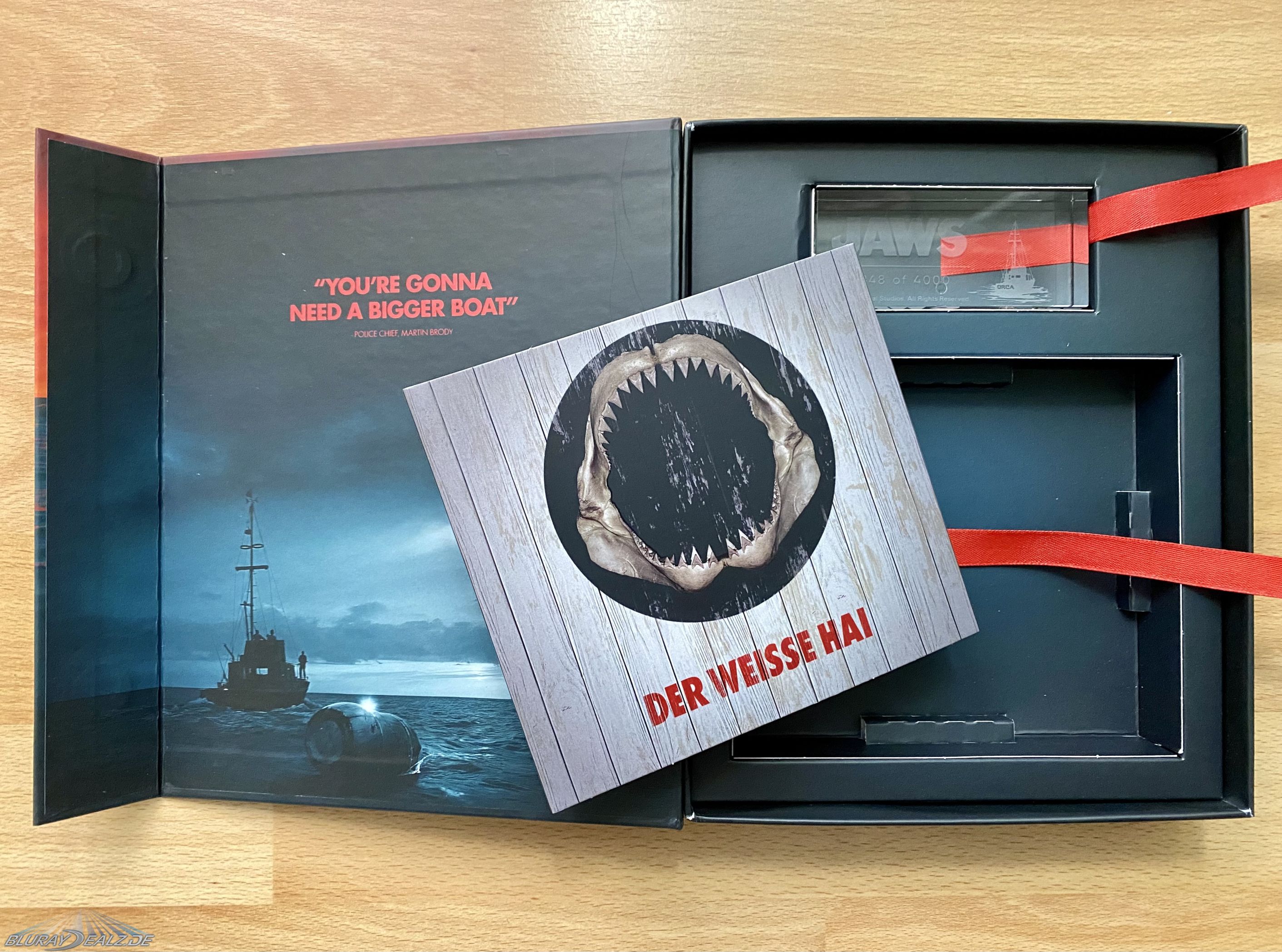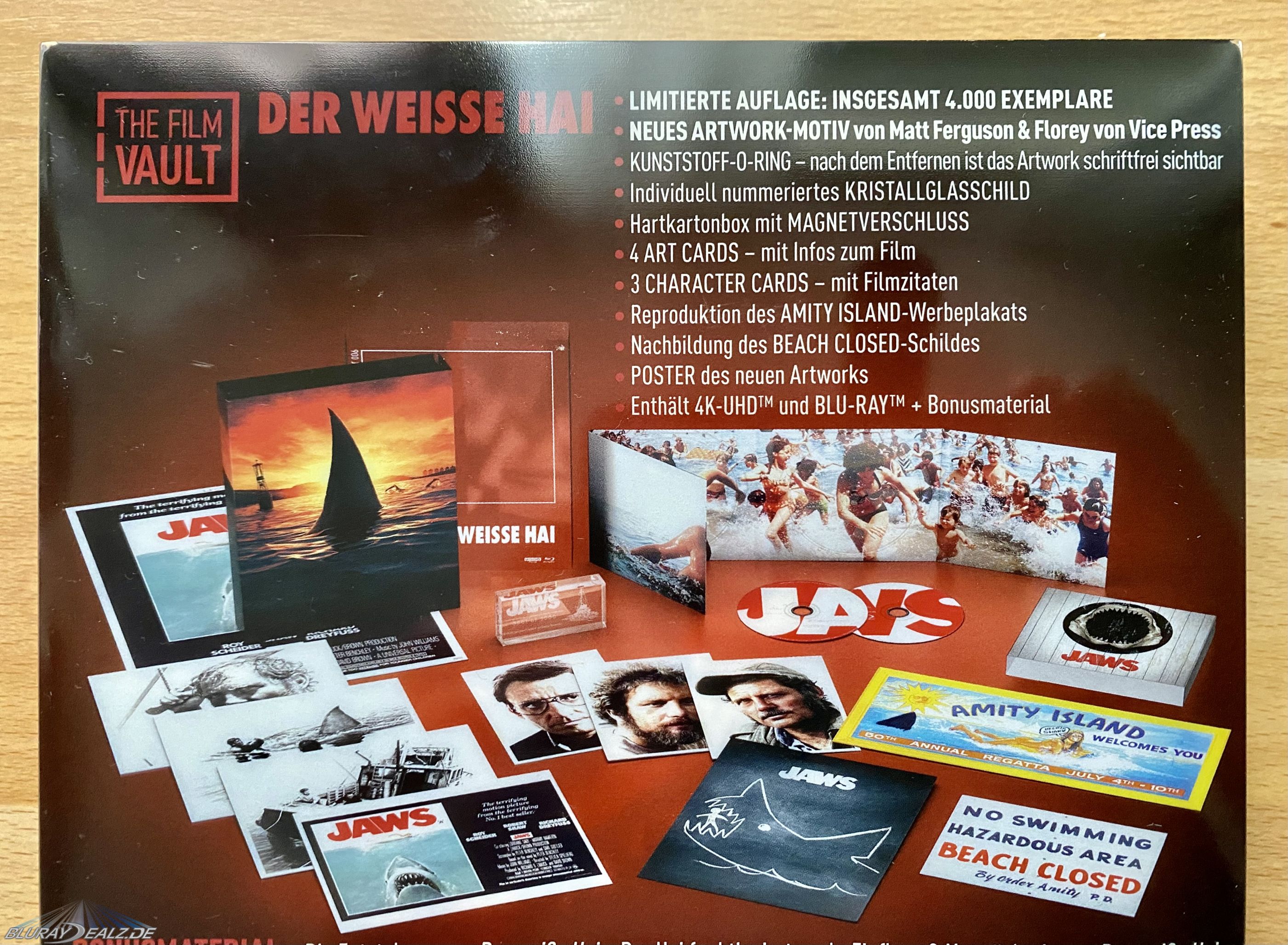 Die Edition ist schwer, stabil, aus dicker Pappe gearbeitet und durch einen durchsichtigen Slipcase geschützt. Der Slipcase enthält auf der Rückseite alle technischen Daten. Das wunderschön gezeichnete Artwork von Matt Ferguson und Florey erstreckt sich von der Front bis über den Spine und ist komplett in matt gehalten (keinerlei Prägung). Die Rückseite ziert ein Foto von „Bruce“, so wie der Hai liebevoll von allen genannnt wurde. Öffnen lässt sich die Edition durch eine doppelte Magnetschließe. In der Box befindet sich der Umschlag mit Artcards, Poster etc., sowie dem Crystal und der beiden Discs. Von der Aufmachung her alles sehr schön verarbeitet.