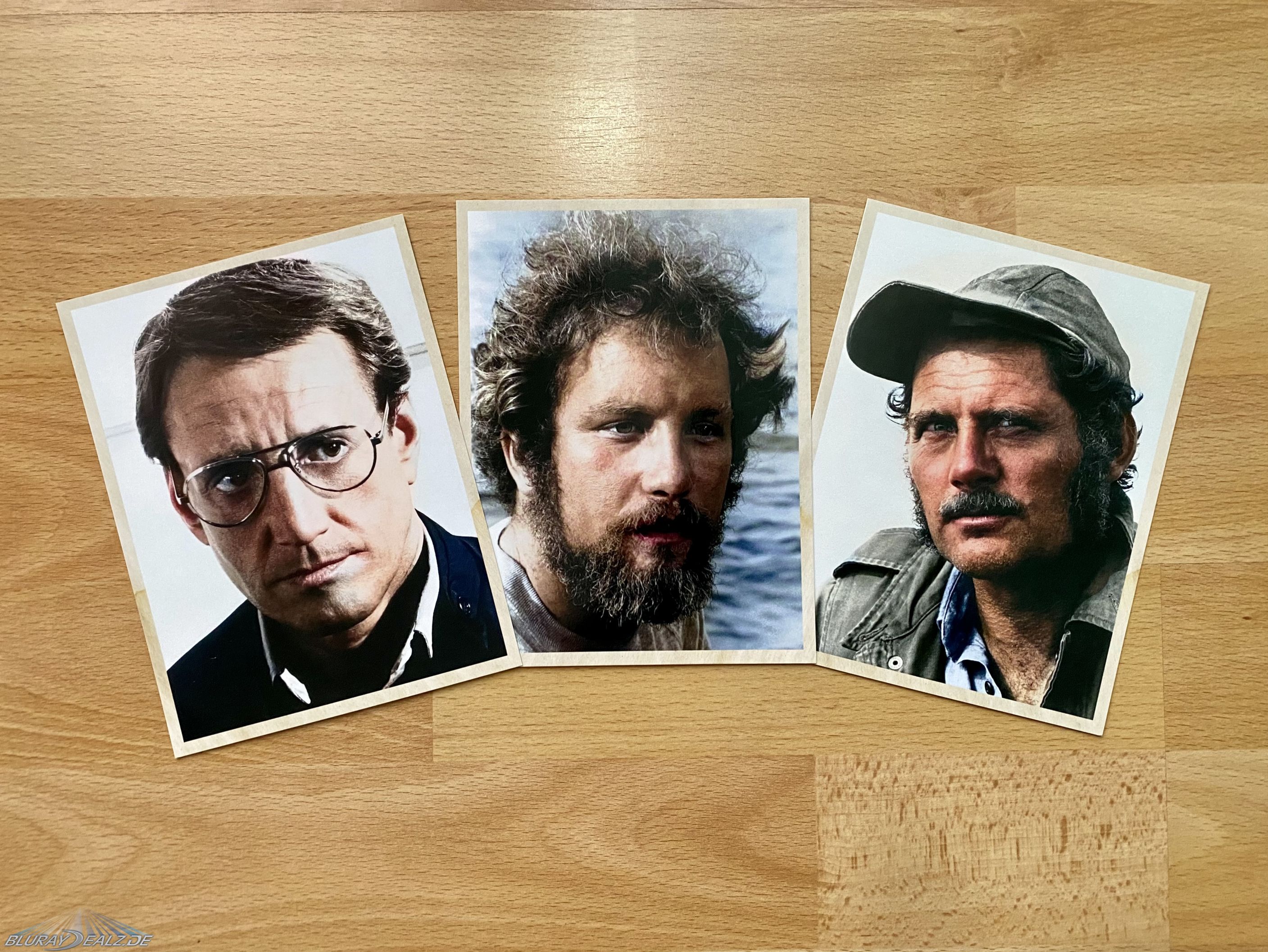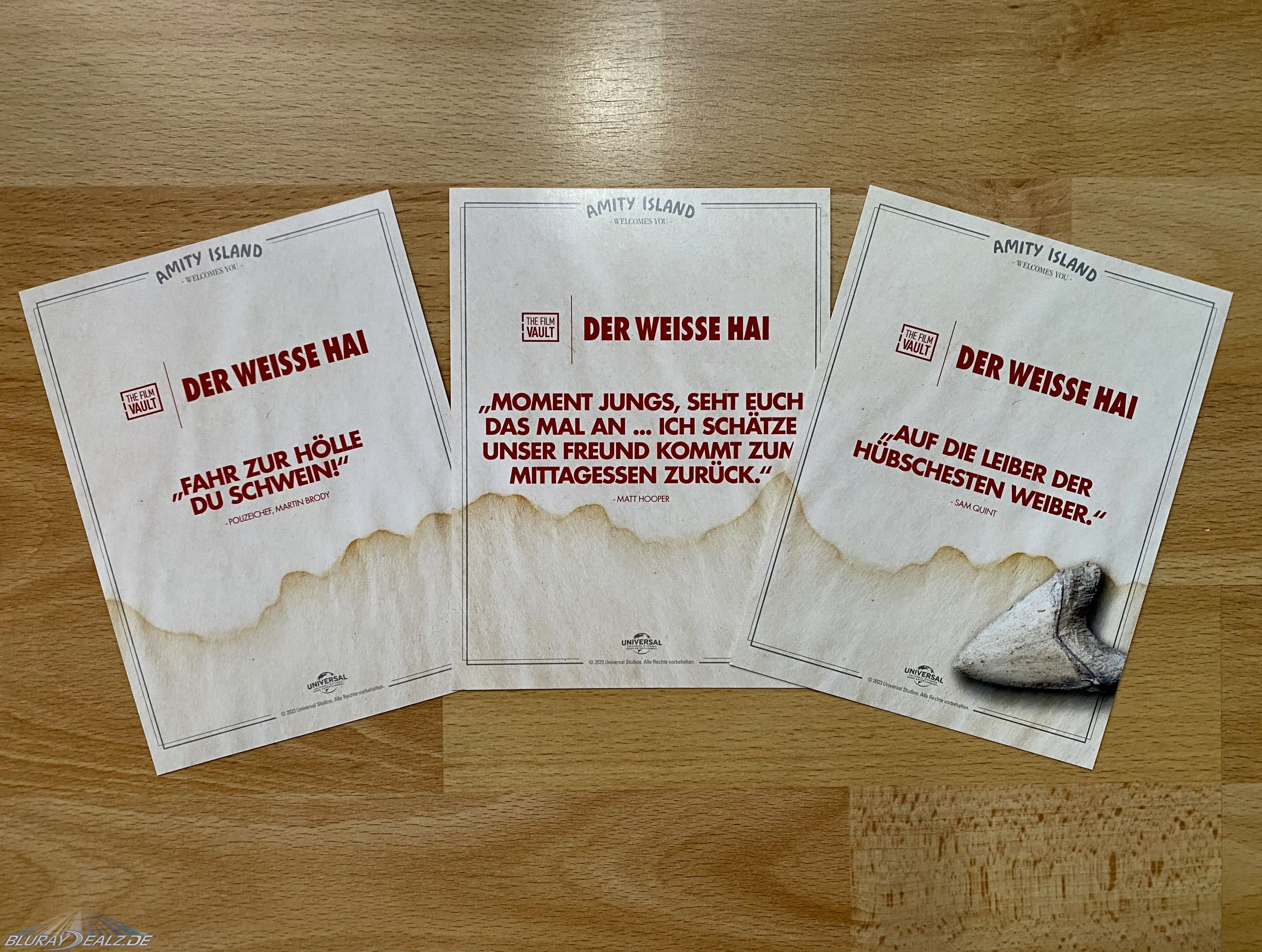 Alle Cards sind in Hochglanz gedruckt, die Fotos von sehr guter Qualität. Die 4 Artcards enthalten auf der Rückseite alle wichtigen Informationen zum Film und liefern sogar per QR-Code die exakten Daten des fiktiven Drehortes Amity Island. Eine echt coole Idee! Die 3 Character Cards kommen auf der Rückseite mit Filmzitaten in ihren Rollen als Chief Brody, Matt Hooper und Sam Quint.