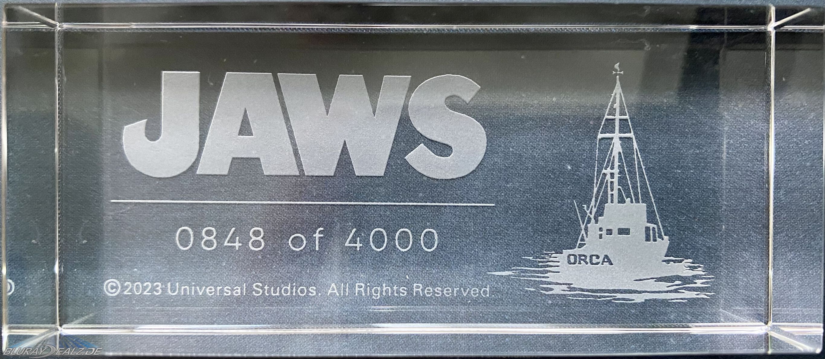 Der Crystal (ein kleiner Block aus Glas) ist mit der individuellen Limitierungsnummer versehen und ziert den Filmtitel sowie die ORCA (0848 of 4000).