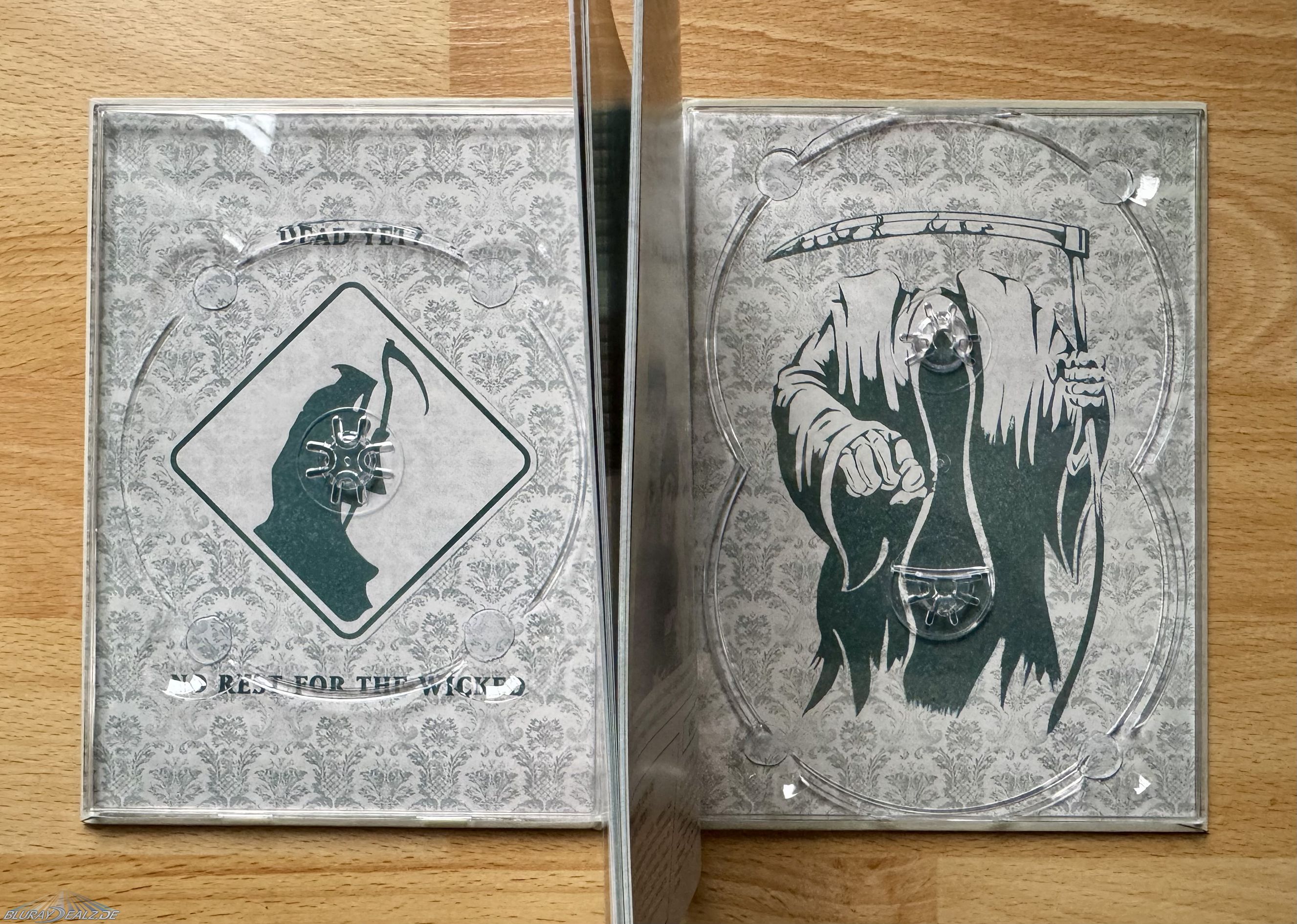Öffnet man das Mediabook so befindet sich auf der linken Seite die erste 4K UHD Disc, auf der letzten Seite im Mediabook sind die zweite 4K UHD Disc und die Bonus Blu-ray übereinander angeordnet.