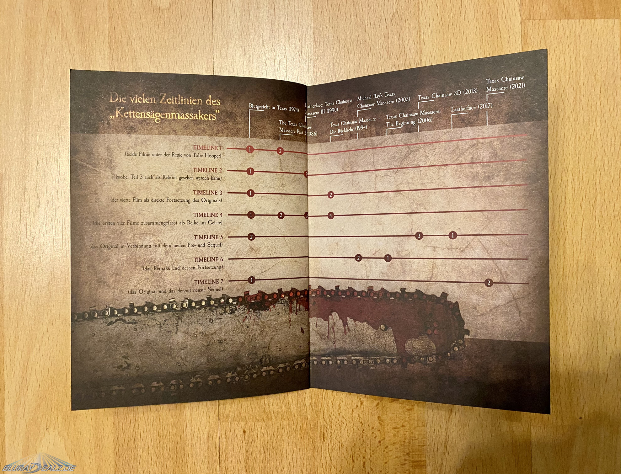 Besonders interessant finde ich das Kapitel Die vielen Zeitlinien des „Kettensägenmassakers“. Dort wird anhand einer Timeline jeweils der Regisseur den entsprechenden Filmen zugeordnet und vorallem auch die Frage geklärt, was Original, Fortsetzung, Pre- und Sequel, oder Reboot ist.