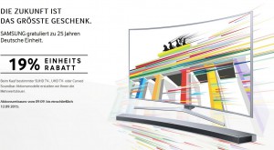 SAMSUNG gratuliert zu 25 Jahren Deutsche Einheit und erstattet daher beim Kauf bestimmter SUHD TV-, UHD TV- oder Curved Soundbar-Aktionsmodelle die Mehrwertsteuer. Aktionszeitraum: vom 09.09. bis einschließlich 12.09.2015. Einekauft werden können die Geräte überall, müssen dann lediglich online registriert werden.