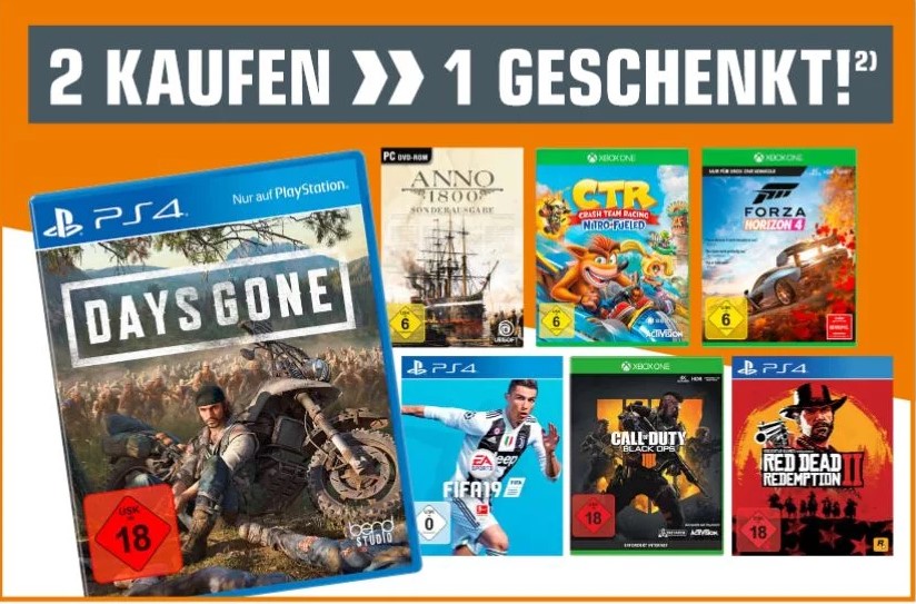 *Bei Kauf von 3 vorrätigen / sofort verfügbaren Titeln aus dem Bereich Games (ausschließlich PS4, Xbox, PC-Spiele) erhalten Sie einen Nachlass in Höhe des Günstigsten. Ausgenommen von der Aktion sind: Nintendo Switch- und , 3DS-Games, Vorbestellerartikel, Anwendersoftware, Bücher, sämtliche Downloads, Downloadcards und Guthabenkarten (z.B. iTunes, Steam, PSN, Xboxlive, etc.), Merchandiseartikel und Prepaidkarten. Rückgabe im Markt nur, wenn alle drei Titel zusammen zurückgegeben werden. Gewährleistungsansprüche bleiben hiervon unberührt. Beim Onlinekauf wird der Nachlass in Höhe des günstigsten Artikels auf alle drei Artikel anteilig gemäß dem Kaufpreis verteilt. Je Onlinekauf können maximal 15 Titel in den Warenkorb gelegt werden, wobei im selben Warenkorb nur unterschiedliche Titel ausgewählt werden können. Bei Onlinekauf keine Coupon-Einlösung möglich.