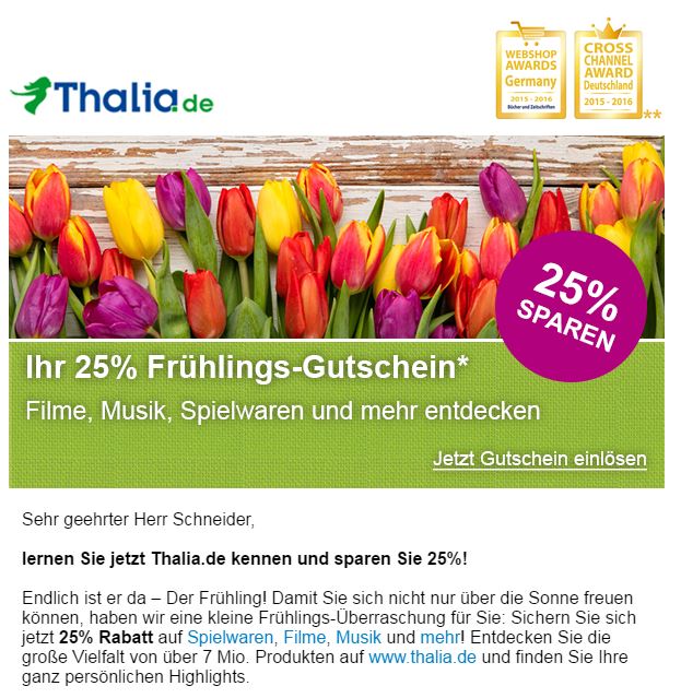 Thalia verschickt gerade 25% Gutscheine per Email. Prüft also eure Postfächer. Gutschein-Code ist gültig bis zum 01.05.2016.