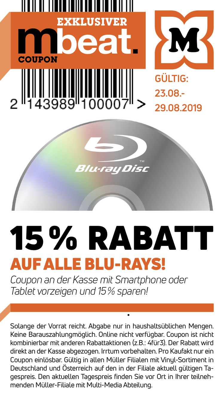 Mueller.de hat wieder 15% Rabatt auf alle Blu-Rays für alle mBeat Leser. Den Code gibt es in der App. Die Aktion geht vom 23.08.-29.08.19.