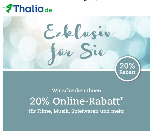 Thalia.de versendet per Email einen 20% Gutschein für den Onlineshop. Dieser Gutschein gilt auf das gesamte Sortiment allerdings nur für Neukunden.