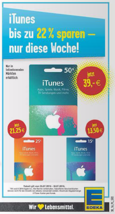 Private Joker hat den neuen Beitrag [Offline] Edeka: 50€ iTunes Guthaben für 39€ (gültig vom 25.07. bis 30.07.16) geschrieben vor 9 Jahren, 3 Monaten