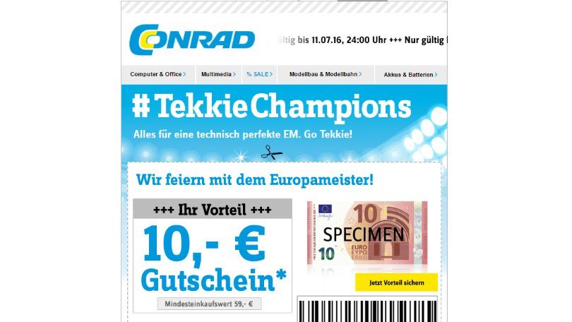 Private Joker hat den neuen Beitrag Conrad.de: 10€ Gutschein ab 59€ (nur am 11.07.2016 gültig) geschrieben vor 9 Jahren, 4 Monaten